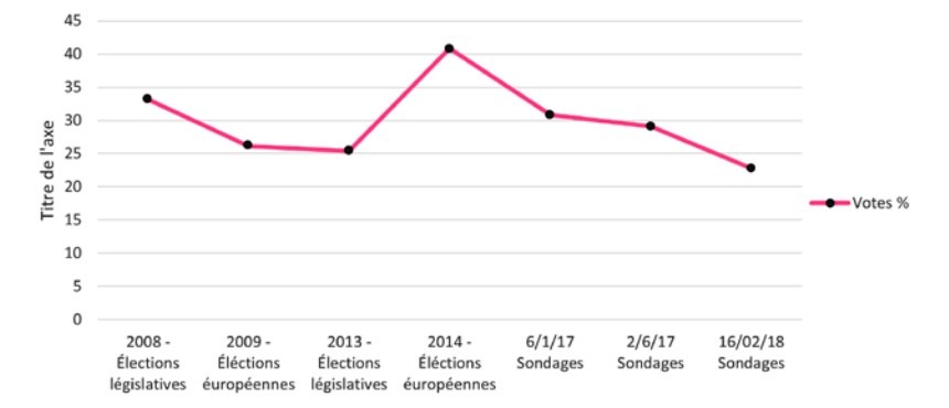 Malgré son succès aux élections européennes de 2014 (40,8%), le Parti démocrate a connu ensuite des résultats peu brillants à l’échelle locale. Pour les élections du 4 mars 2018, les sondages anticipent même une chute des intentions de vote (voir graphique 2). La participation aux élections internes du parti (primaires et élections du secrétaire) a également subi une baisse constante depuis de 2007.