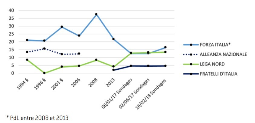Néanmoins, ces trois forces sont d’ores et déjà alliées dans de nombreux gouvernements locaux et soutiennent ensemble les gouvernements d’importantes régions, comme en Ligurie, en Lombardie, en Vénétie ou encore en Sicile. C’est à la fois l’orientation majoritairement à droite de l’électorat italien et le mode de scrutin mis en place pour les élections des membres de la Chambre des députés et du Sénat qui ont poussé à la formation de coalitions et expliquent pourquoi ces trois partis sont désormais alliés pour les prochaines élections. Une telle alliance a été facilitée par le fait que ce nouveau régime électoral favorise d’autant plus la formation de coalitions qu’il ne requiert pas de leader ni de programme en commun.