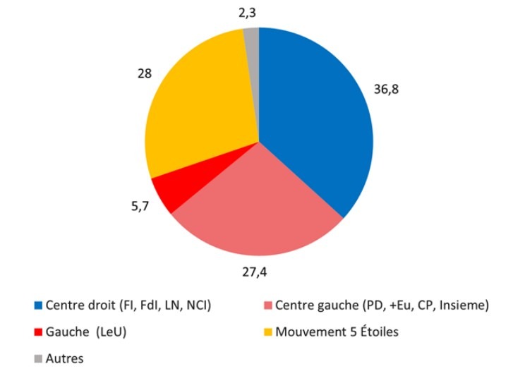 Pour ces élections italiennes, trois forces politiques se dégagent. À droite, une coalition des droites, composée de Forza Italia (centre-droit), de la Ligue du Nord (Lega Nord) et des Frères d’Italie (Fratelli d’Italia), semble favorite. À gauche, le Parti démocrate (Partito Democratico, PD) sort affaibli de cinq ans de pouvoir, avec trois présidents du Conseil (Enrico Letta, Matteo Renzi et Paolo Gentiloni) qui se sont succédé avec plus ou moins de réussite. Enfin, un parti populiste, le Mouvement 5 étoiles (Movimento 5 Stelle, M5S), apparaît comme le premier parti politique d’Italie mais ses chances de gouverner sont restreintes en raison de son refus catégorique de s’allier avec d’autres partis.