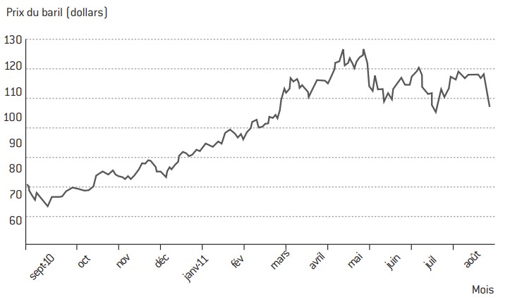 Graphique 5 : Évolution du prix du baril de pétrole (en dollars), fin août 2010 – début août 2011