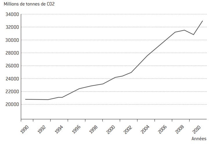 Graphique 6 : Émissions de dioxyde de carbone dans le monde provenant du pétrole, du charbon et du gaz (en millions de tonnes de CO2), 1990-2010