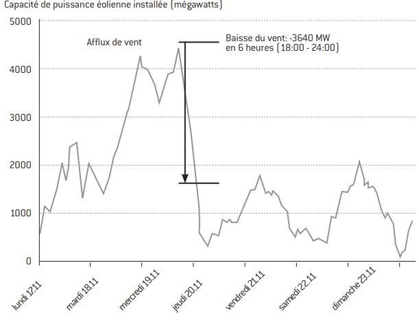 Fluctuations de la puissance éolienne dans la zone de contrôle (en mégawatts), E.On Netz (Allemagne), novembre 2003 (note 11)
