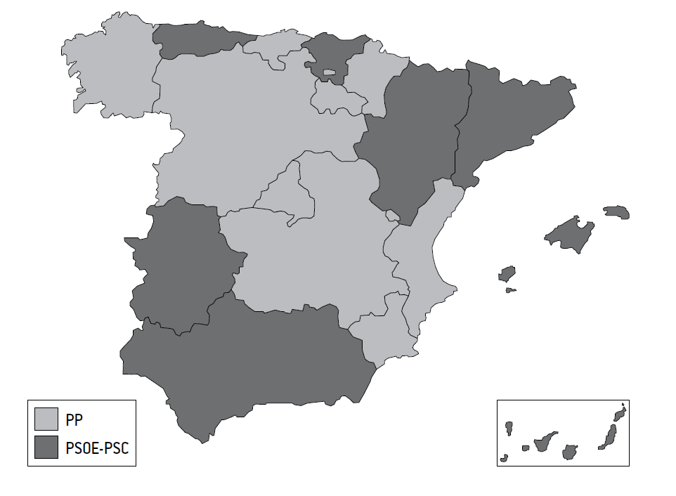 Aux élections européennes de juin 2009, le Partido Popular consolide ses positions dans les régions précitées et récupère la première place aux îles Baléares et aux îles Canaries. Dans presque toutes les Communautés autonomes, le combat politique est structuré par l’affrontement entre le PSOE et le PP, dupliquant la configuration nationale. La Catalogne et le Pays basque font naturellement figure d’exceptions : les forces politiques en présence sont plus diverses, en raison de l’existence de la question régionale. Les partis nationalistes catalan et basque sont, dans ces communautés, la principale force politique de centre-droit. D’autre part, en Catalogne, les socialistes ont leur propre organisation, le PSC, juridiquement et formellement différenciée et autonome du PSOE.