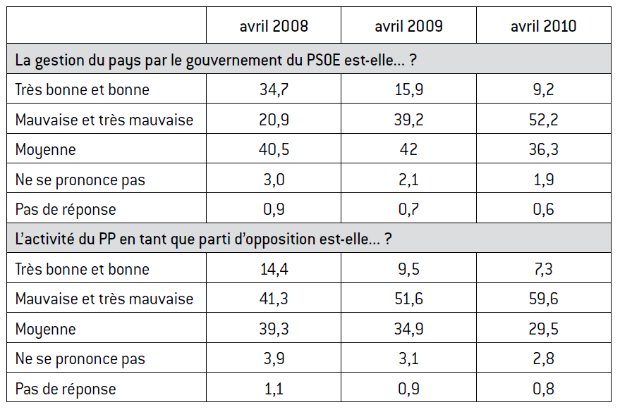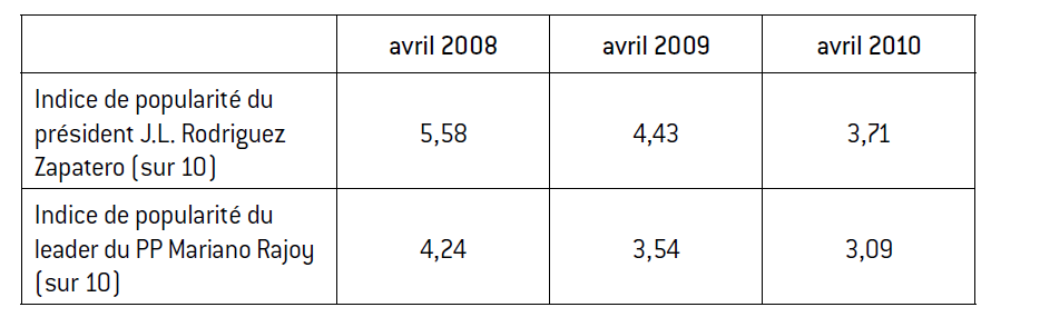 Comme le montrent les tableaux 2 et 3, le regard de plus en plus négatif que les citoyens espagnols portent sur la politique gouvernementale ne s’accompagne d’aucune progression des opinions favorables au PP. Son leader Mariano Rajoy apparaît ainsi incapable de présenter une alternative de changement crédible. Les affrontements entre l’opposition et le gouvernement qui rythment la publication des données macroéconomiques n’ont pas permis de renforcer la crédibilité du PP. S’il était au gouvernement, il n’apporterait pas, selon les électeurs, de meilleures solutions à la crise. Au parlement, le PP n’a présenté qu’un faible nombre de propositions auxquelles les autres partis d’opposition se sont ralliés. Seules quelques-unes d’entre elles, portant notamment sur la baisse des dépenses publiques (suppression de postes de hauts fonctionnaires, de quelques ministères…), ont été appuyées par d’autres groupes. Cette stagnation du PP a été aggravée par les accusations de corruption qu’il doit affronter. Durant ces deux dernières années, des malversations ont entaché la gestion des différentes Communautés autonomes qu’il gouverne (Communauté valencienne, Madrid, Castilla-León) ou a récemment gouverné (îles Baléares) et la direction financière du parti elle-même. La réaction de Mariano Rajoy et de son entourage face à ces problèmes est apparue comme insuffisante, entamant davantage son crédit dans l’opinion.