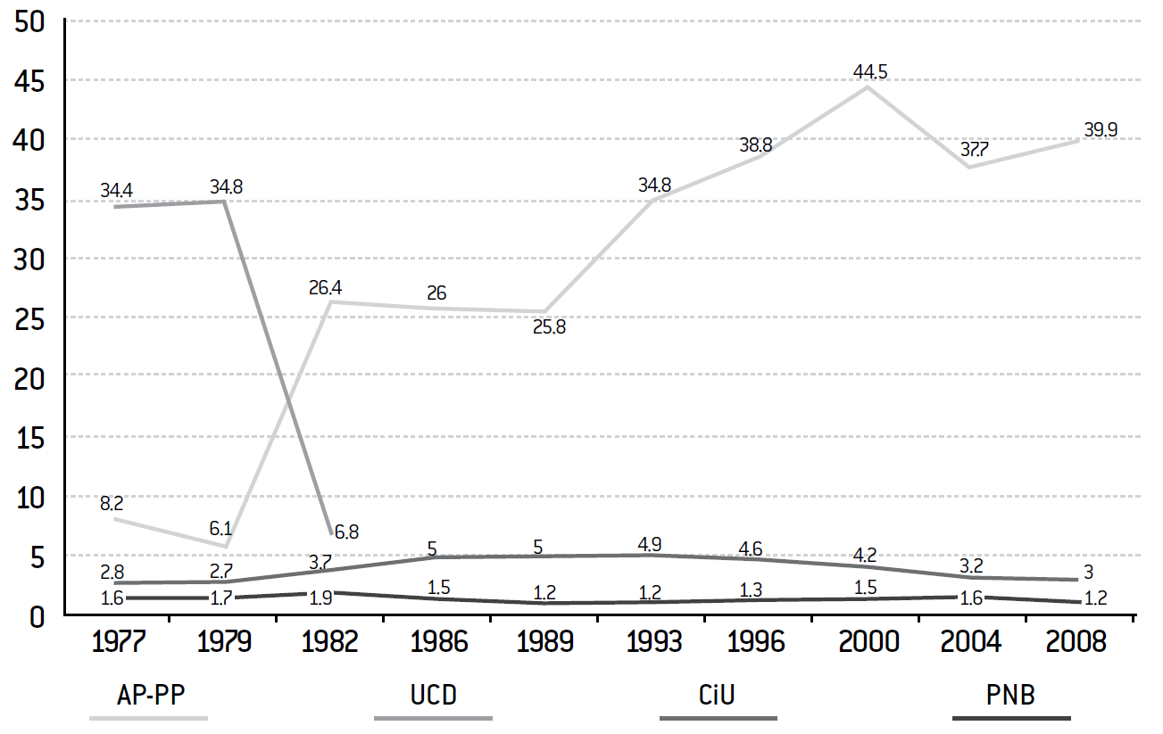 À la fin du franquisme, la Catalogne voit la naissance d’un parti de centre droit, Convergència Democràtica de Catalunya (CDC), où se rassemblent différents secteurs d’opposition au franquisme d’orientation modérée et catalaniste. Présidé depuis sa fondation par Jordi Pujol, CDC se présentera aux premières élections de 1977 à la tête d’une coalition, Pacte Democràtic per Catalunya. Depuis 1979, CDC s’est allié de façon stable avec Unió Democràtica de Catalunya, petit parti d’inspiration démocrate chrétienne fondé à la fin de la IIe République12.
