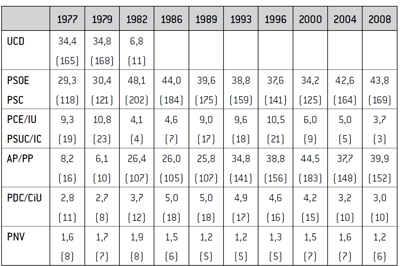 Comme le montre le tableau 1, aux premières élections de juin 1977, l’ensemble de la droite (UCD, AP, PDC, PNV) obtient 47% des voix et 200 sièges sur les 350 que compte le Congrès des députés, contre 38,6% et 137 sièges pour les partis de la gauche traditionnelle (socialistes et communistes). Lors des élections suivantes, en 1979, les résultats connaissent une légère évolution, avec une avancée de la gauche (41,2% des voix, 144 sièges) et un petit recul de l’ensemble de la droite (45,3% des voix, 144 sièges).