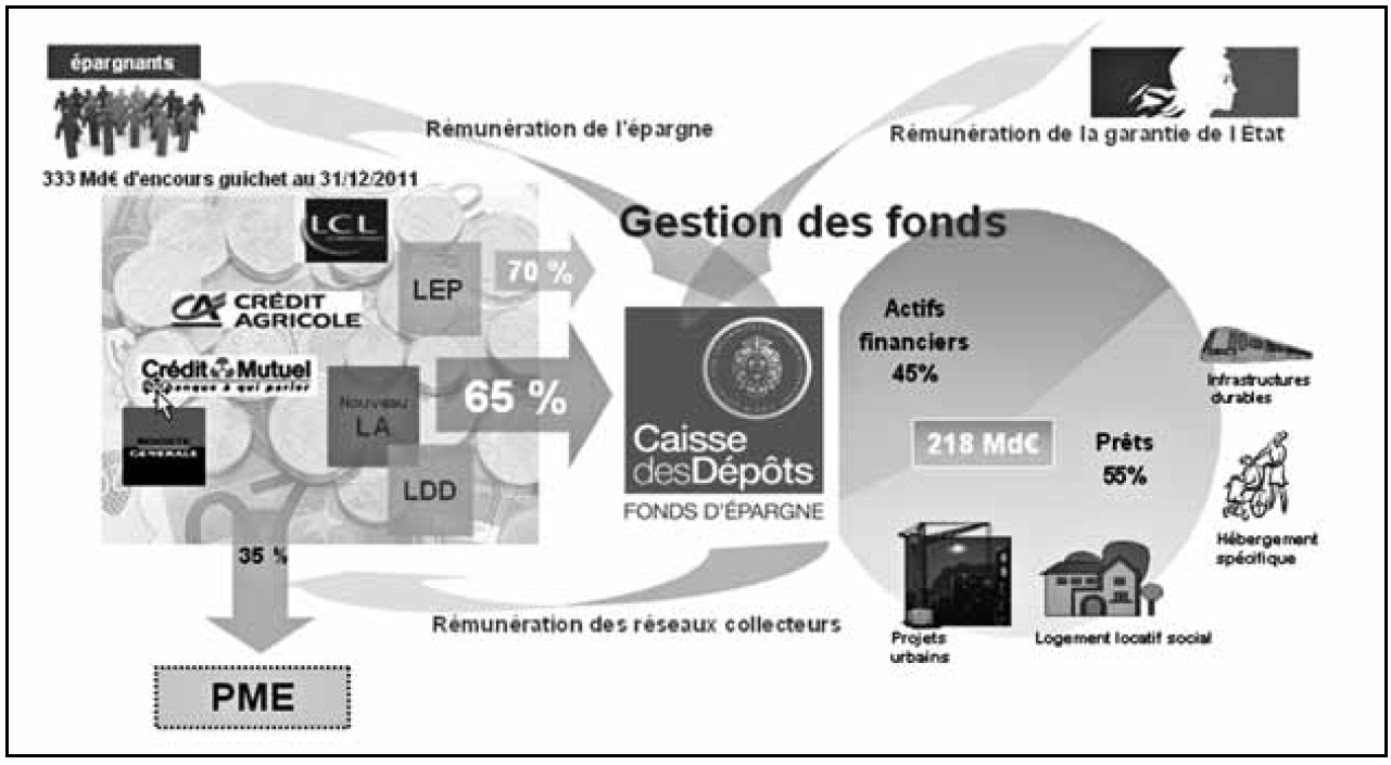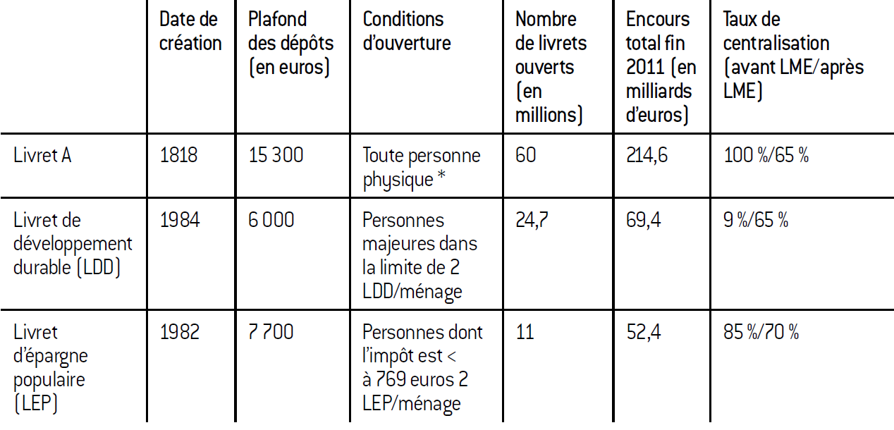 L’épargne populaire – livret A (LA, ou livret bleu), livret de développement durable (LDD) et livret d’épargne populaire (LEP) – est une épargne défiscalisée, garantie par l’état et liquide. Jusqu’en 2008, ces livrets étaient distribués par trois banques seulement (La Banque postale, Caisse d’épargne et Crédit mutuel). Le livret A était alors intégralement centralisé au fonds d’épargne de la Caisse des dépôts, le LDD à 9% et le LEP à 85%. La section du fonds d’épargne, dont le bilan est entièrement séparé du reste des activités du groupe Caisse des dépôts, a comme première mission de protéger l’épargne ainsi centralisée et de financer les missions d’intérêt général définies par l’état.