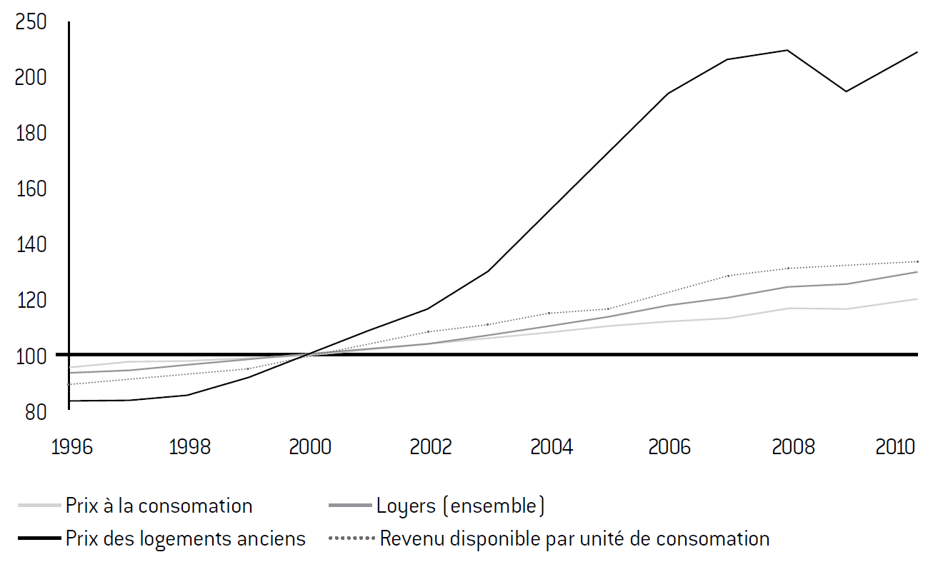 Crise et logement sont des mots qui restent indissociables. Cette crise a des manifestations multiples qui varient d’une catégorie de ménage à une autre et qui ne sont pas ressenties de manière égale sur les différents territoires. La première d’entre elles est celle, récente, de l’envolée des prix de l’immobilier : en dix ans, ils ont plus que doublé sur l’ensemble de la France métropolitaine. Cette forte augmentation est totalement décorrélée de la progression des revenus dans la même période. Le second phénomène, qui caractérise la crise du logement et découle souvent du premier, est la hausse du taux d’effort des ménages, c’est-à-dire de la part des dépenses qu’ils consacrent au logement rapportée à leurs revenus. Ainsi, corrigé des aides à la personne, entre 2004 et 2007, le taux d’effort médian des locataires est passé de 26% à près de 30% dans le parc privé, celui des locataires du parc social de 22% à 24%. Les taux d’effort varient d’une catégorie de ménage à l’autre et diffèrent selon les statuts d’occupation : une étude récente de l’Insee1 relève que pour les ménages modestes du parc privé, le taux d’effort net des aides est de 32%, alors qu’il est de 23% pour la catégorie la plus aisée. Pour les locataires du parc social, le taux d’effort net des aides est de 23%. Enfin, pour près d’un ménage sur dix, le taux d’effort net est supérieur à 44%. Bien souvent, l’augmentation du taux d’effort s’explique par la hausse des loyers, plus forte au moment des relocations dans le secteur privé, et par la hausse des charges, notamment liées à l’énergie. Ces tensions sur les efforts consentis par les ménages locataires les plus modestes découlent largement de la hausse des prix de l’immobilier. Les statistiques les plus récentes2 ne tiennent en effet pas encore compte des effets de la crise économique et sociale qui touche durement la France depuis 2008, de l’augmentation du nombre de chômeurs et la faiblesse de l’évolution des revenus dans cette période. Ce constat a de fortes conséquences : il exclut une part de plus en plus significative des ménages de l’accès au logement, notamment ceux qui ne sont pas éligibles au logement social, et il conduit à des modifications de parcours résidentiels : les ménages se logent de plus en plus loin de leur lieu de travail et diminuent la surface de leur logement. Autant de facteurs qui réduisent la qualité de vie et le bien-être des citoyens, notions dont l’importance a été rappelée récemment par le rapport de la commission Stiglitz3.
