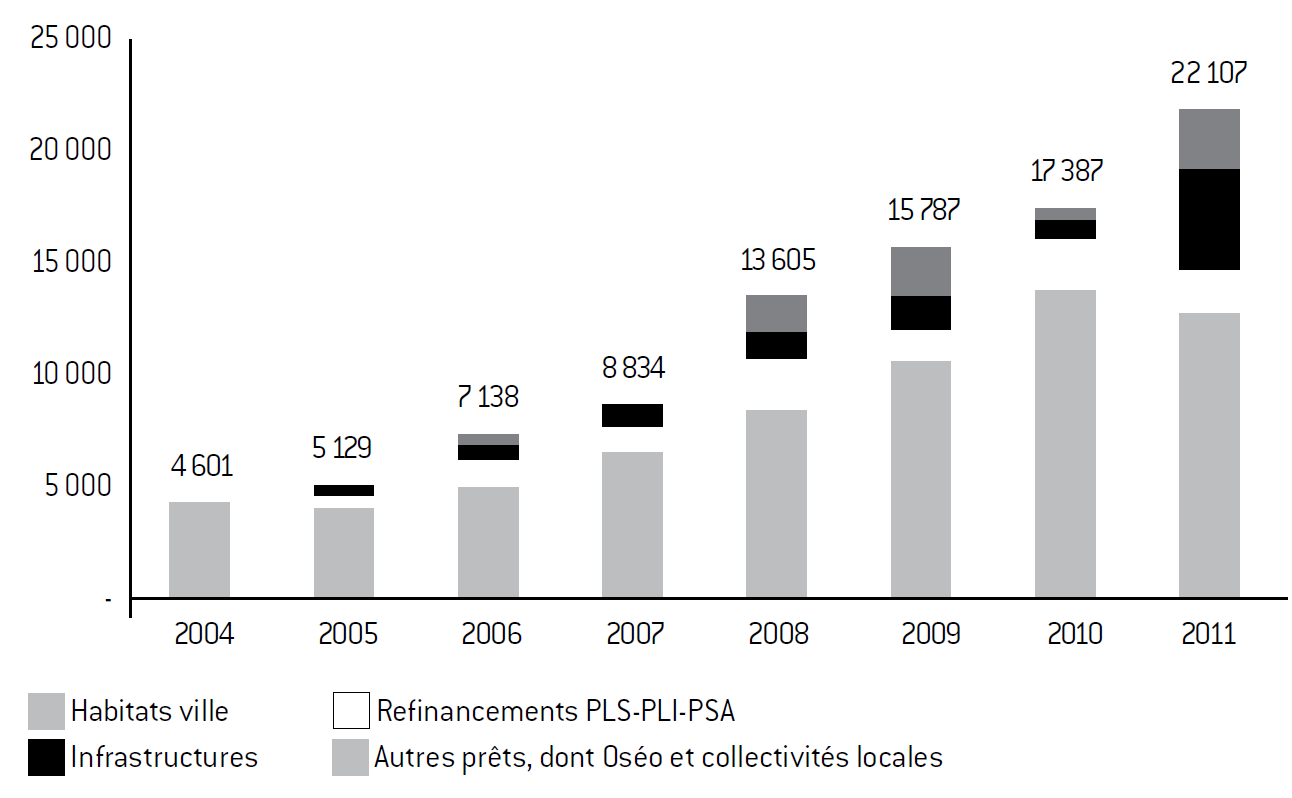 Conformément aux choix des pouvoirs publics en matière de construction des logements sociaux, les prêts sur fonds d’épargne ont connu une expansion spectaculaire ces dernières années : entre 2004 et 2011, le volume des prêts sur fonds d’épargne à destination de la politique de la ville et de l’habitat a été multiplié par trois. Cette augmentation est supérieure au nombre de logements construits en raison de l’inflation des prix du foncier qui a également caractérisé la période.