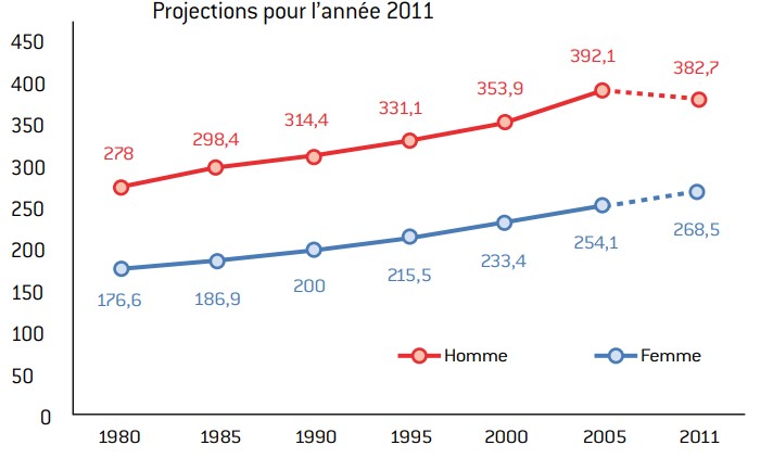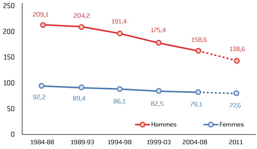 Graphique 11 : évolution de la mortalité observée (taux standardisé monde) par cancer de 1984-1988 à 2004-2008, selon le sexe. Projections pour l’année 2011.