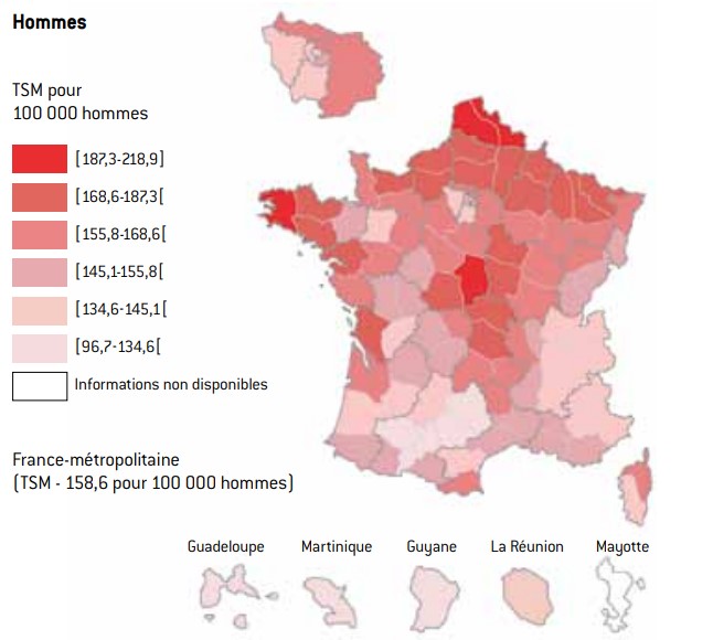 cartes : taux standardisés à la population mondiale de mortalité par cancer à l’échelle départementale (2004-2008)