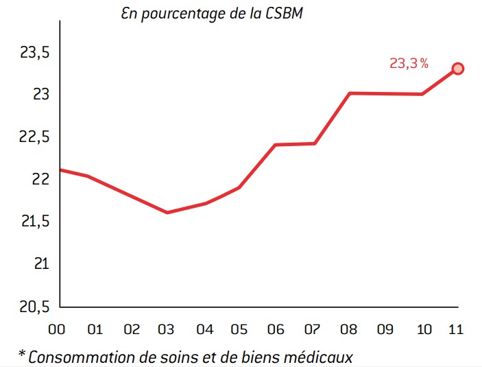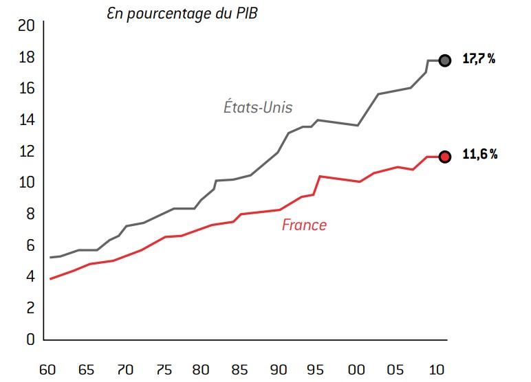 Les dépenses de santé progressent rapidement dans tous les pays développés. Elles augmentent en volume, mais également en proportion du revenu national. En France, elles ont représenté 11,6% du PIB en 20114. En 2050, elles pourraient avoisiner un cinquième du PIB.
