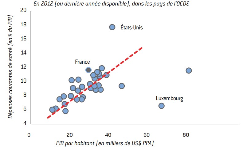 Source de difficulté supplémentaire, l’analyse macroéconomique exclut la pertinence de hausses de cotisations sociales ou de l’impôt pour financer un surcroît de dépenses de santé. Avec un taux de prélèvements obligatoires de 44,5 % du PIB en 2012, la France est l’un des pays où la fiscalité est la plus élevée au monde. Or, dans un environnement de concurrence commerciale et fiscale globalisée, un tel niveau d’impôt n’est économiquement pas neutre sur la production et l’emploi d’un pays. Le taux actuel des cotisations sociales alourdit sensiblement le coût du travail et il est l’un des facteurs qui affaiblit la compétitivité-prix des entreprises. Le coût du travail est d’ailleurs l’une des causes de la persistance du chômage de masse en France. La France est le pays de l’OCDE où les cotisations patronales en proportion du coût du travail sont les plus importantes. Un tel niveau pourrait être économiquement neutre si le salaire brut des travailleurs français n’était pas également élevé ce qui, in fine, modérerait le coût du travail. Or le salaire brut des Français est important car il inclut directement un niveau important de cotisations salariales et, indirectement, l’impôt sur le revenu (voire la TVA). La France est ainsi l’un des pays de l’OCDE où le degré de taxation total des revenus du travail (le « coin fiscal ») est le plus fort. Il n’apparaît donc pas judicieux de relever davantage les cotisations sociales supportées par les entreprises. La solution réside donc exclusivement dans la régulation des dépenses de santé.