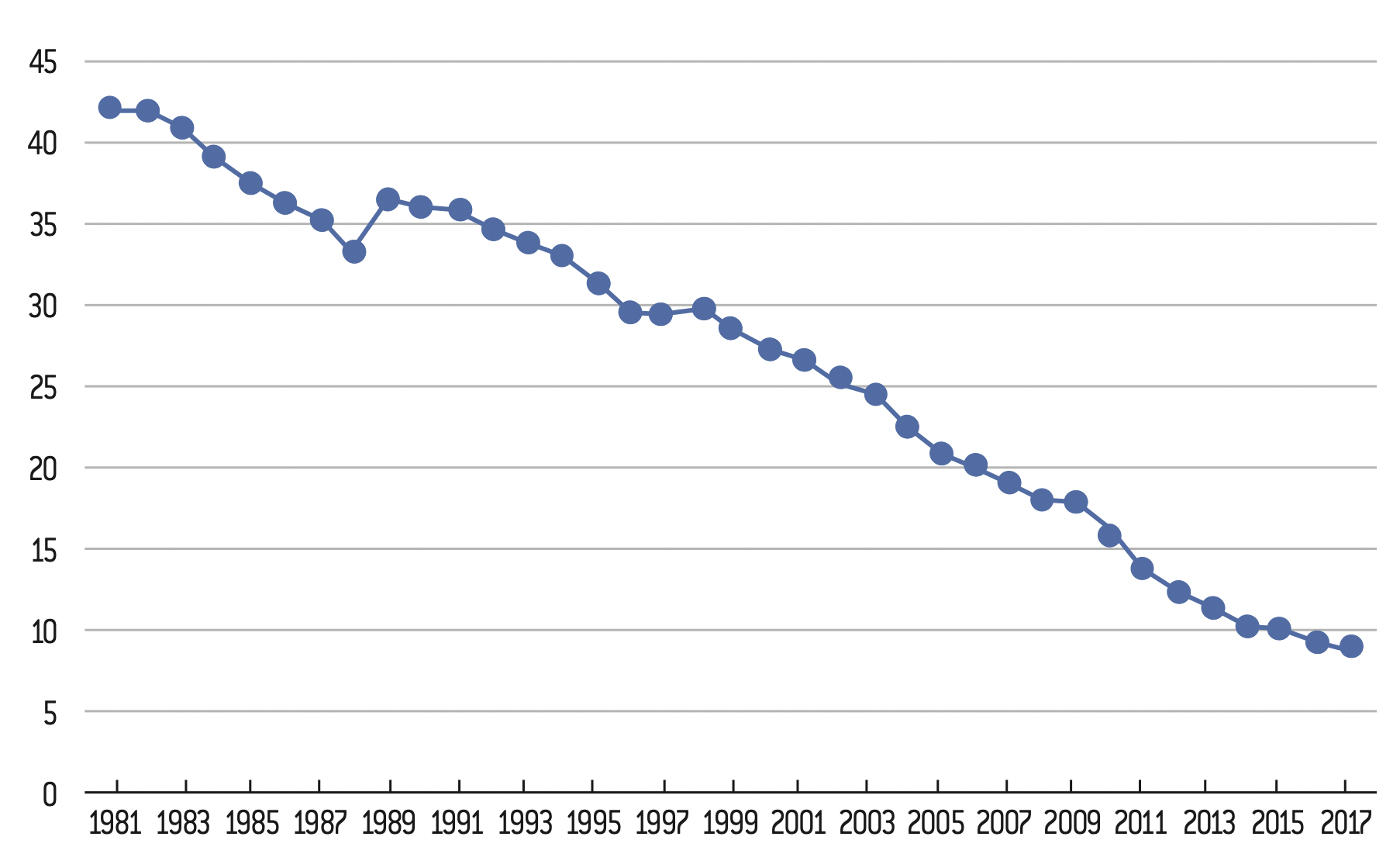 Évolution du taux de pauvreté dans le monde, 1981-2017 (en %)