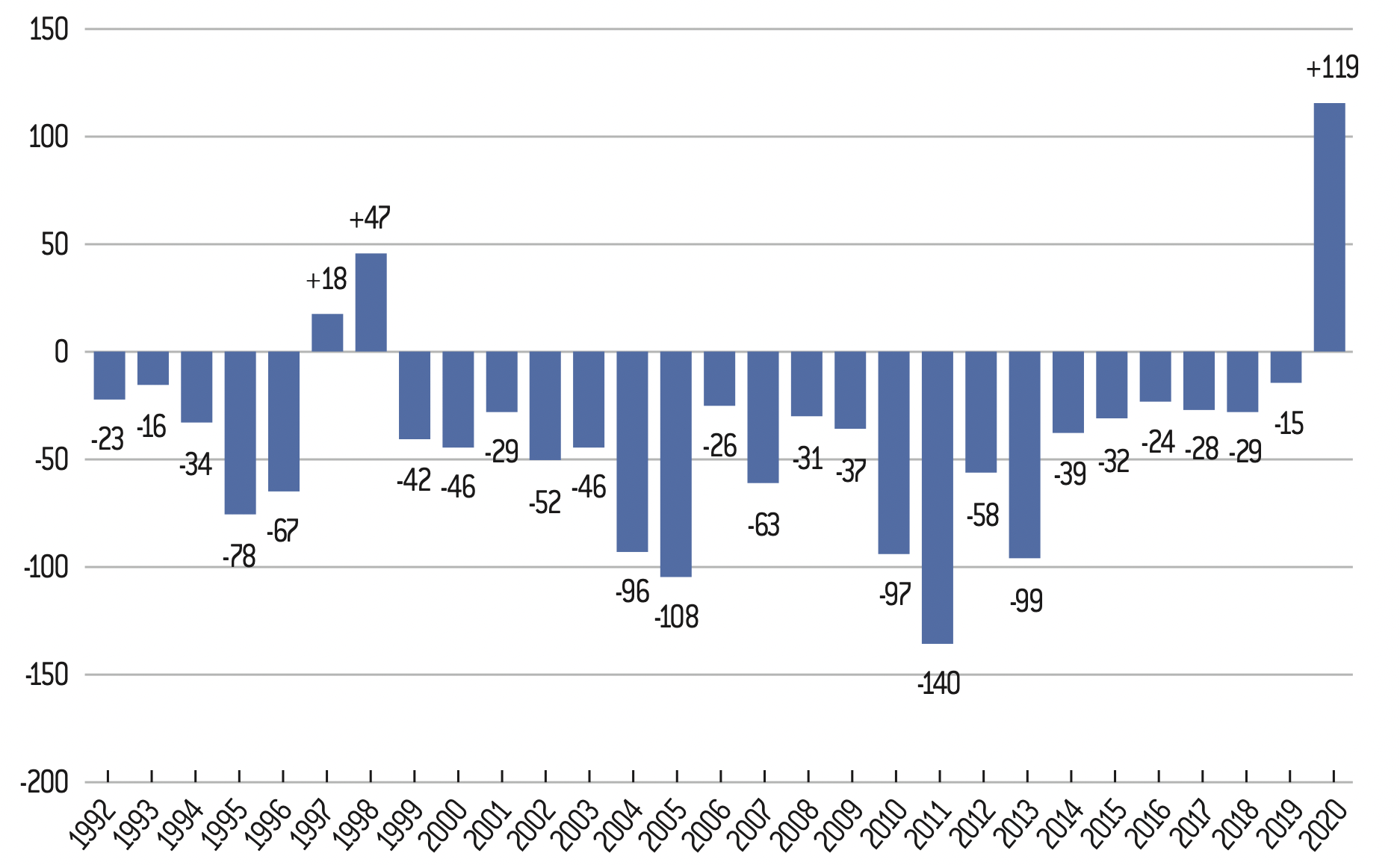 Quelles que soient les estimations successivement établies 23, d’avril 2020 à janvier 2021, l’augmentation de la pauvreté extrapolée pour 2020 est vraiment sans précédent depuis près d’un demi-siècle. Notre graphique 3 montre l’évolution annuelle du nombre de personnes pauvres entre 1992 et 2020. Durant les trente dernières années, la seule crise qui a eu un impact à la hausse sur la pauvreté est la crise financière asiatique, qui a vu la pauvreté croître de 18 millions d’individus en 1997, puis de 47 millions en 1998.
