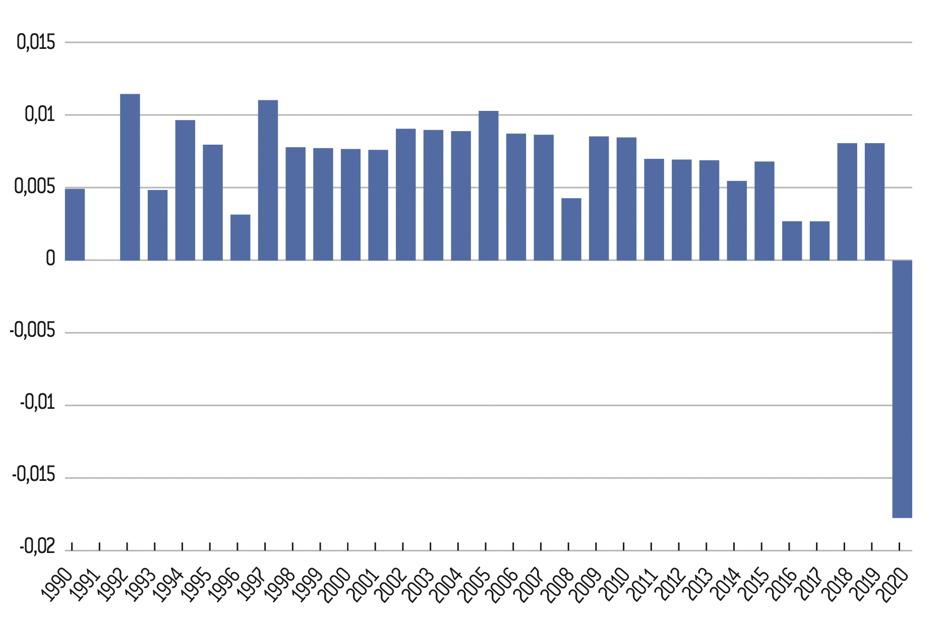 Évolution annuelle de la valeur de l’IDH global, 1990-2020