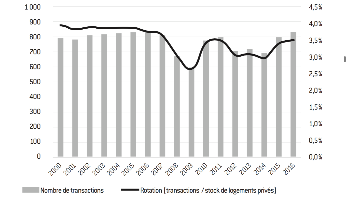 On constate une tendance à la baisse de la vitesse de rotation des logements existants (mesurée, par exemple, par le rapport entre les transactions et le stock de logements privés disponibles à la vente), alors que les données sociétales et économiques accroissent le besoin de mobilité des ménages, avec des problèmes subséquents : risque d’allocation sous-optimale de la ressource logement (sur- et sous-occupation des logements), effet délétère sur la mobilité et l’emploi du fait du refus de mobilités se traduisant par une hausse des coûts logement. Ainsi 70% des personnes volontaires pour changer de région afin de trouver un emploi refusent de le faire si cela induit une augmentation de leurs dépenses logement. La situation n’est pas fondamentalement différente si l’on prend en compte l’acquisition des logements neufs : 437.200 logements autorisés en glissement annuel à la fin du troisième trimestre 2016 et 369.500 logements mis en chantier sur la même période.