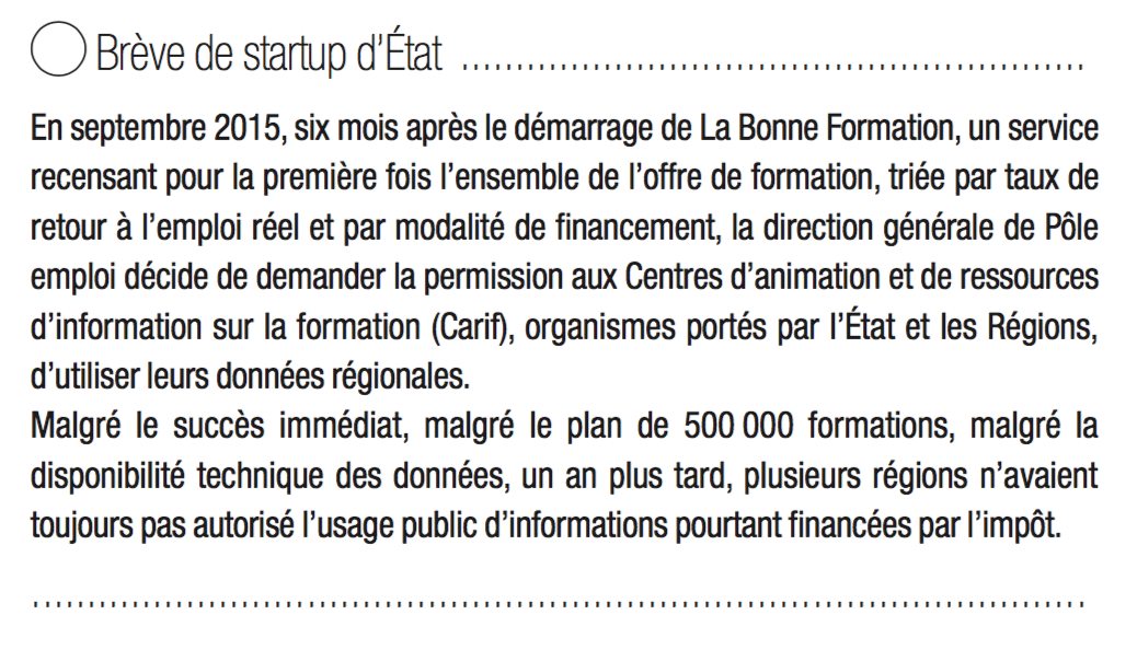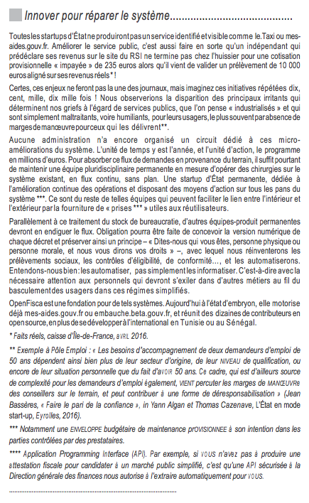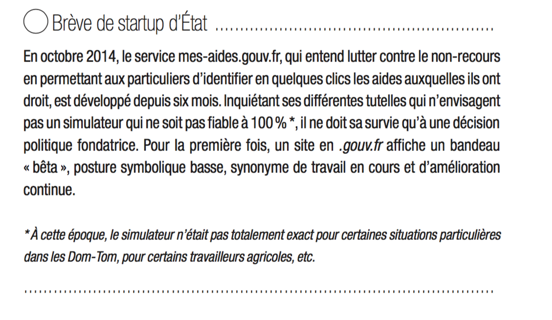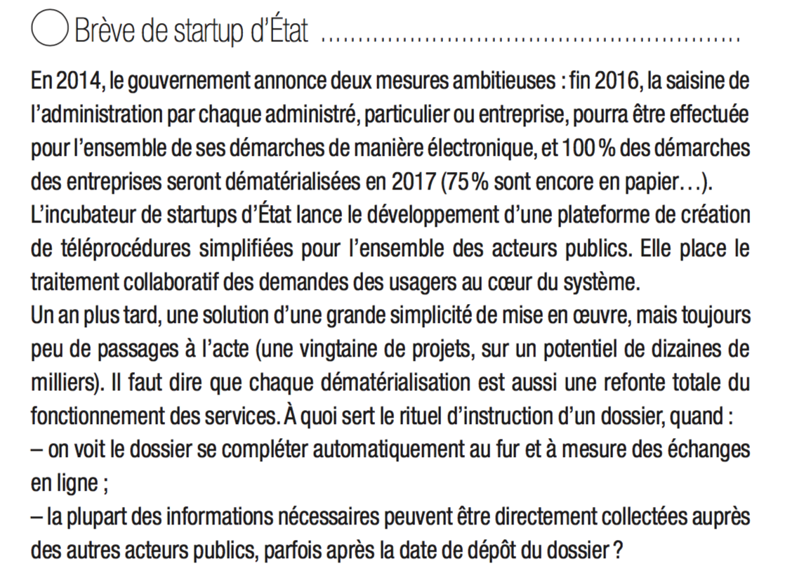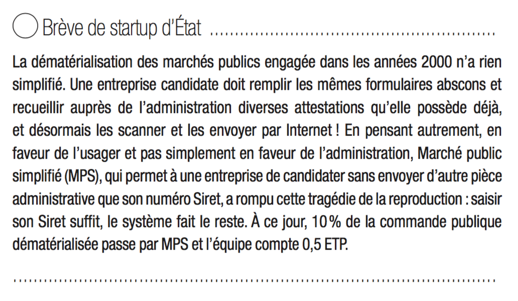Depuis 2013, emmenées par des agents publics déterminés, de petites équipes maîtrisant parfaitement les codes du numérique ont revivifié les valeurs de sens, d’autonomie et de responsabilité trop souvent absentes des grandes organisations. Dans une exceptionnelle frugalité de moyens, elles ont produit des services publics numériques plébiscités par leurs usagers. Par analogie avec les méthodes de production et d’organisation des startups, nous les avons appelées « startups d’État », même si elles ne visent ni le profit ni l’entrée en bourse.