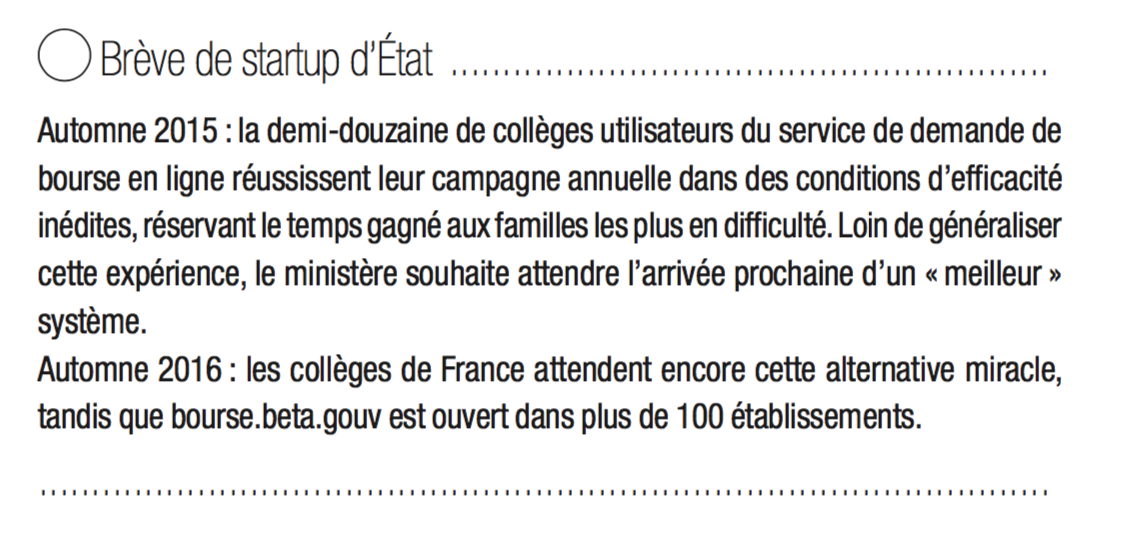 Depuis juin 2013, l’État a pu expérimenter une nouvelle manière de construire des services publics numériques. Comme annoncé dans une précédente note en 201312, l’exigence d’innovation radicale nous a conduits à initier des « startups d’État », loin de toute contrainte, pour qu’elles ne reproduisent pas les règles explicites ou implicites qui fondent le service tel qu’il existe aujourd’hui. Une startup d’État n’a pas besoin de capital privé : c’est simplement une équipe de deux à quatre personnes, dirigée par un agent public, financée par une administration et totalement autonome pour satisfaire ses usagers, comme le ferait une startup Internet.