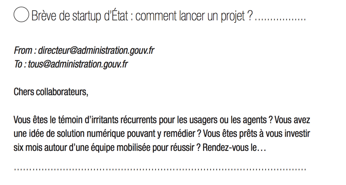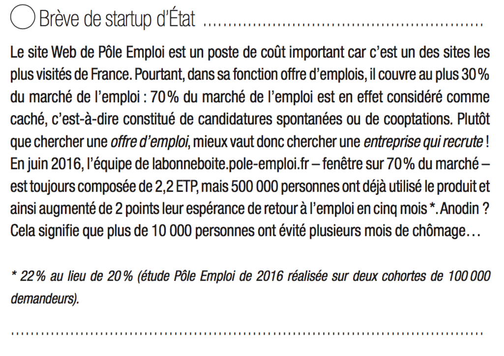 Enfin, comme nous l’avons expérimenté avec Pôle Emploi, où deux startups portées par des agents sont lancées tous les ans, ce dispositif passe facilement à l’échelle. Pour multiplier le nombre d’initiatives, il ne faut pas chercher des innovations, mais chercher des innovateurs. Multiplier par cent les moyens de l’incubateur et de futurs incubateurs publics en allant piocher un « 0,1% innovation14 » dans les différentes administrations, puis inviter les intrapreneurs en leur sein à développer leurs solutions à des problèmes vécus en libérant leurs marges de manœuvre permettra à la fois d’accroître le nombre d’initiatives et de généraliser celles en succès. Des centaines d’incubateurs numériques petits et grands, des milliers d’intrapreneurs, voilà bien une nouvelle forme de modernité, assise sur un pari de la confiance. Expérimentations réelles avant les lois qui les généralisent, systèmes opérationnels avant les décrets qui les encadrent15, la possibilité d’une nouvelle politique d’innovation publique s’ouvre à nous.