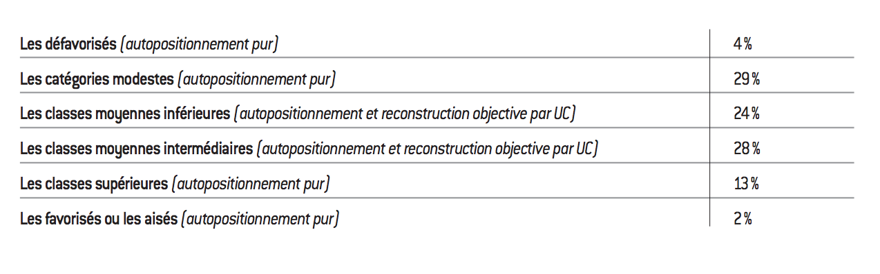 Dans le cadre de l’enquête réalisée2 par l’Ifop pour la Fondation pour l’innovation politique et dont les résultats ont nourri l’analyse présentée dans les pages qui suivent, le critère subjectif de l’autopositionnement a été privilégié. Cela répond, d’une part, à des exigences pratiques liées au recueil de l’information, mais aussi et surtout à l’ambition poursuivie. Elle consiste à renouer avec une lecture plus sociétale, moins strictement économico-descriptive, et qui serait en mesure de saisir des dimensions plus psychologiques sur lesquelles les définitions construites à partir d’un critère objectif – quel qu’il soit – font l’impasse. Il s’agit en effet de cerner ce qui conditionne le sentiment d’appartenance aux classes moyennes. L’autopositionnement s’inscrit dans une logique relativiste et induit par là même une lecture plus globale de la société : le positionnement dépend à la fois de la conscience qu’a l’individu de son propre capital économique et culturel, mais également de la manière dont il perçoit la structure sociale environnante. De la synthèse de ces deux éléments naît la projection de soi dans l’échelle sociale. Ce rapport à l’altérité explique ainsi qu’à des niveaux de revenu identiques, deux individus puissent estimer appartenir à des catégories différentes (et vice-versa). Les jugements sont ainsi conditionnés par nombre de facteurs, parmi lesquels le milieu social d’origine et la trajectoire par rapport à celui-ci, ainsi que le sentiment de reconnaissance, qui peuvent être considérés à bon droit comme déterminants. L’autopositionnement présente dans le même temps un certain nombre de limites qu’il ne s’agit pas de nier. C’est le cas notamment du phénomène de sous-déclaration d’appartenance aux catégories aisées, produit d’une posture courante consistant à considérer que le riche, c’est celui qui est plus riche que soi. De même, on devine également la difficulté qu’il peut y avoir à admettre appartenir aux catégories défavorisées : inversement, le pauvre, c’est celui qui est plus pauvre que soi. Autant de processus qui relèvent d’un mécanisme de relativisme social et qui viennent expliquer sans doute le fait qu’une proportion écrasante de la population déclare faire partie des classes moyennes : 52% des Français se vivent comme des Français moyens, ni pauvres ni riches, proportion qui atteint même 65% si on y surajoute les personnes se définissant comme « classe supérieure ».