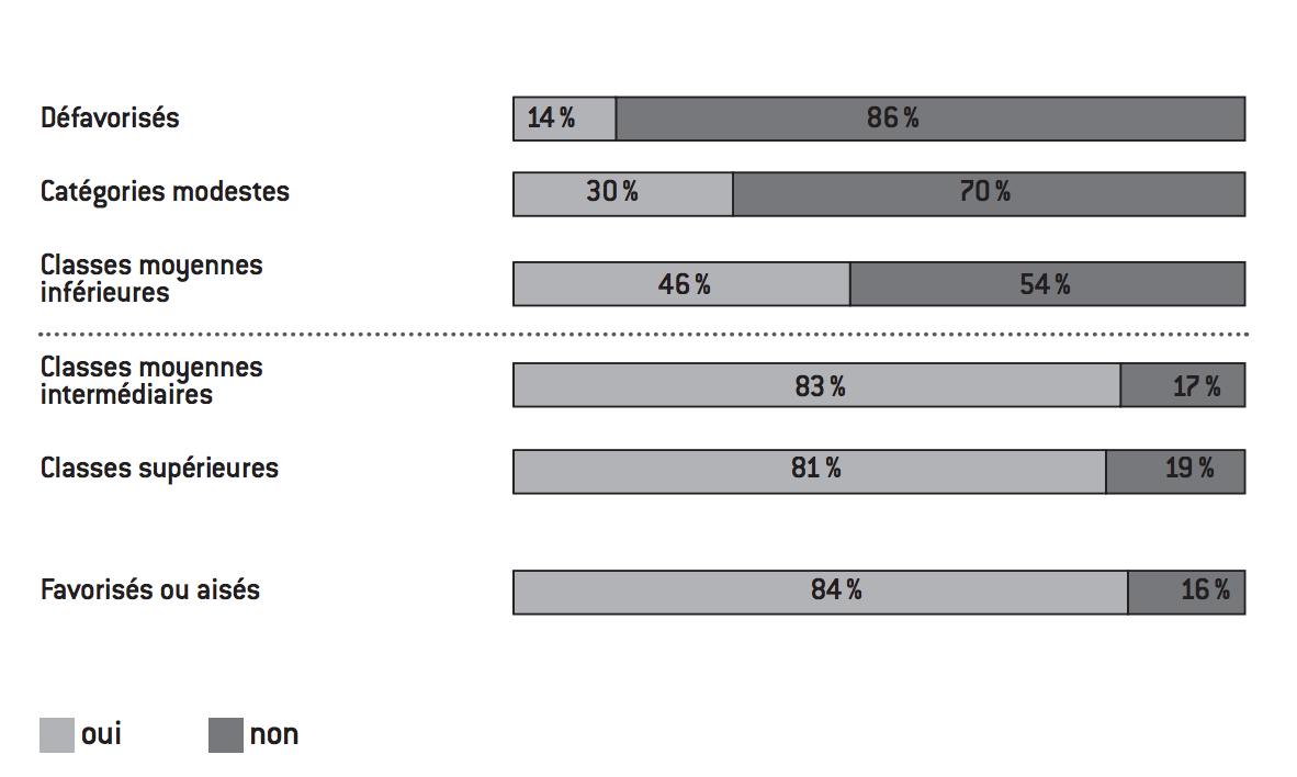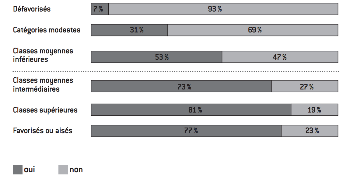 Deux bémols apparaissent : le taux de propriétaires atteint déjà 43% parmi les modestes, et s’il y a donc un écart entre ces modestes et la classe moyenne inférieure, il n’est « que » de 11 points et est surtout symbolique de par le franchissement du seuil des 50%. À titre de comparaison, le saut est beaucoup plus important entre les défavorisés, très rarement propriétaires (22% seulement), et les modestes (43%, soit 21 points de différence), dont on voit qu’ils constituent un sas d’entrée dans la « France des propriétaires », statut qui demeure hors de portée de près de trois quarts des défavorisés. Second bémol, il existe également au sein même des classes moyennes, un gap important (17 points) entre la classe moyenne inférieure, finalement assez proche des modestes, et la classe moyenne intermédiaire, très largement propriétaire (71%) et distante de seulement quelques points de la classe supérieure (75% de propriétaires), voire des favorisés (78%). Si le statut de « propriétaire majoritaire » signe bien l’entrée dans la classe moyenne, tout comme la détention d’une assurance-vie, ce critère fait également naître un clivage important entre la classe moyenne inférieure (tout juste majoritairement propriétaire) et la classe moyenne intermédiaire (quasiment trois quarts de propriétaires), alors que le différentiel est très peu marqué concernant l’assurance-vie. La possession d’actions, de fonds communs de placement (FCP) ou de Sicav (concernant 26% des Français), ou d’un logement ou de terres à louer (26% également) est nettement moins fréquente. Des pans entiers de la société en sont dépourvus et ces placements ne semblent être l’apanage que de la classe supérieure (51% pour les placements boursiers, 49% pour des biens immobiliers) et des favorisés ou aisés (respectivement 78% et 47%). Mais les deux classes moyennes sont très largement exclues de ces marchés. Ces produits sont donc plutôt l’attribut de tout ou partie des milieux les plus favorisés et ne peuvent constituer un trait distinctif de nos classes moyennes. Au contraire, c’est bien plutôt leur non-possession qui marque la différence avec les catégories situées au-dessus d’elles. Notons pour finir sur ce point que les écarts entre classes moyennes inférieure et intermédiaire, déjà constatés sur la possession de son logement, se retrouvent également concernant la détention de valeurs mobilières et de produits financiers.