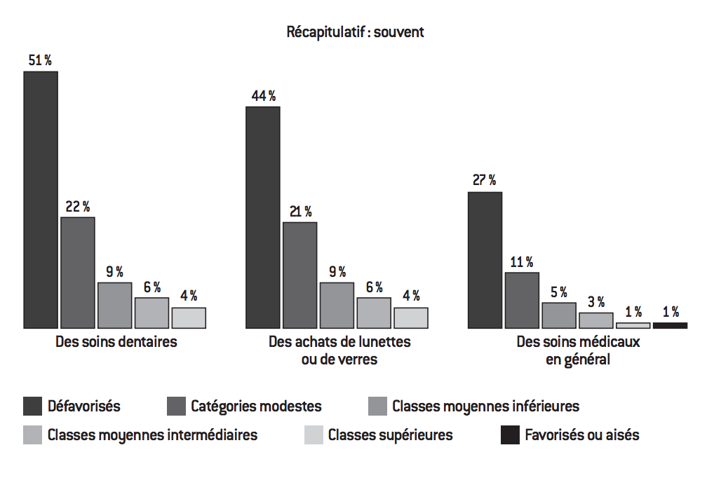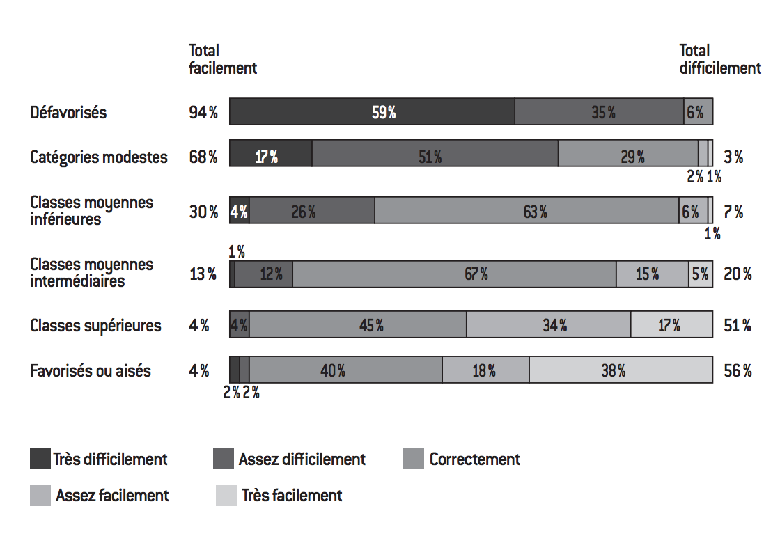 À la question : « comment vous en sortez-vous avec les revenus de votre foyer ? », une écrasante majorité des défavorisés (94%) répond « difficilement » et deux tiers des modestes (68%) font de même. À l’autre extrémité du spectre, une majorité absolue de la classe supérieure (51%) ou des favorisés et des aisés (56%) déclare s’en sortir facilement. Entre ces deux extrêmes très polarisés, les deux classes moyennes se distinguent assez nettement des autres strates et présentent un visage assez semblable. Près de deux tiers de la classe moyenne inférieure (63%) et de la classe moyenne intermédiaire (67%) affirment en effet s’en sortir « correctement ». Cette position équilibrée démontre que ces classes « moyennes » n’ont pas usurpé leur nom. Cela indique également que l’entrée dans leur univers est synonyme d’absence de difficultés financières importantes, qui restent réservées aux défavorisés et aux modestes, même si un tiers (30%) de la classe moyenne inférieure déclare quand même s’en sortir difficilement (contre « seulement » 13% de la classe moyenne intermédiaire). Cette définition plancher d’une entrée dans les classes moyennes, qui se matérialise par une capacité très largement majoritaire à s’en sortir « correctement » et par l’existence d’une minorité rencontrant des difficultés, s’accompagne d’une définition plafond qui signe la sortie des classes moyennes. Ce n’est en effet qu’à partir de la classe supérieure qu’on rencontre une majorité d’interviewés déclarant s’en sortir facilement avec leurs revenus : 51% contre 20% seulement dans la classe moyenne intermédiaire, et 7 % dans la classe moyenne inférieure. Cette position médiane en termes de niveau de vie des classes moyennes, dont les membres pourraient du coup être considérés comme « ceux qui s’en sortent juste correctement », c’est-à-dire sans vivre très largement mais sans non plus de difficultés trop importantes, est confirmée par d’autres critères. Ainsi, comme le montre le graphique suivant, le fait de repousser ou de différer souvent des actes médicaux est tout à fait résiduel parmi les classes moyennes comme dans les catégories les plus aisées, alors que cela est assez fréquent dans les milieux populaires.