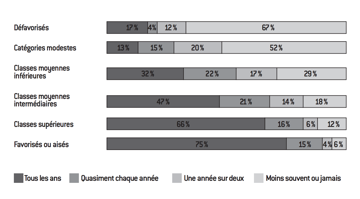 De la même façon, si 79% des défavorisés et 57% des modestes déclarent effectuer une part importante de leurs achats alimentaires en hard discount, cette proportion devient minoritaire dès l’entrée dans la classe moyenne, sans pour autant être négligeable (44% de la classe moyenne inférieure et 32% de la classe moyenne intermédiaire déclarant acheter une part importante de leurs produits alimentaires et d’entretien dans ce type de magasin). Tout en étant moins regardant sur le prix de leur caddy que les milieux les plus modestes, les classes moyennes fréquentent donc d’autres enseignes, même si la pression sur le pouvoir d’achat est bien présente et impose de rogner quelque peu sur certains postes de dépense. La question des vacances est également assez éclairante de la position médiane qu’occupent les classes moyennes en termes de mode de vie. Dans une société de loisirs comme la nôtre, le fait de partir ou non en vacances est très connoté socialement, nos catégories sociales présentant une très forte polarisation sur cette question. Comme on peut le voir ci-dessous, les deux tiers de la classe supérieure et les trois quarts des favorisés ou aisés partent tous les ans, quand, inversement, deux tiers des défavorisés et la moitié des modestes ne partent jamais ou moins d’une fois tous les deux ans.