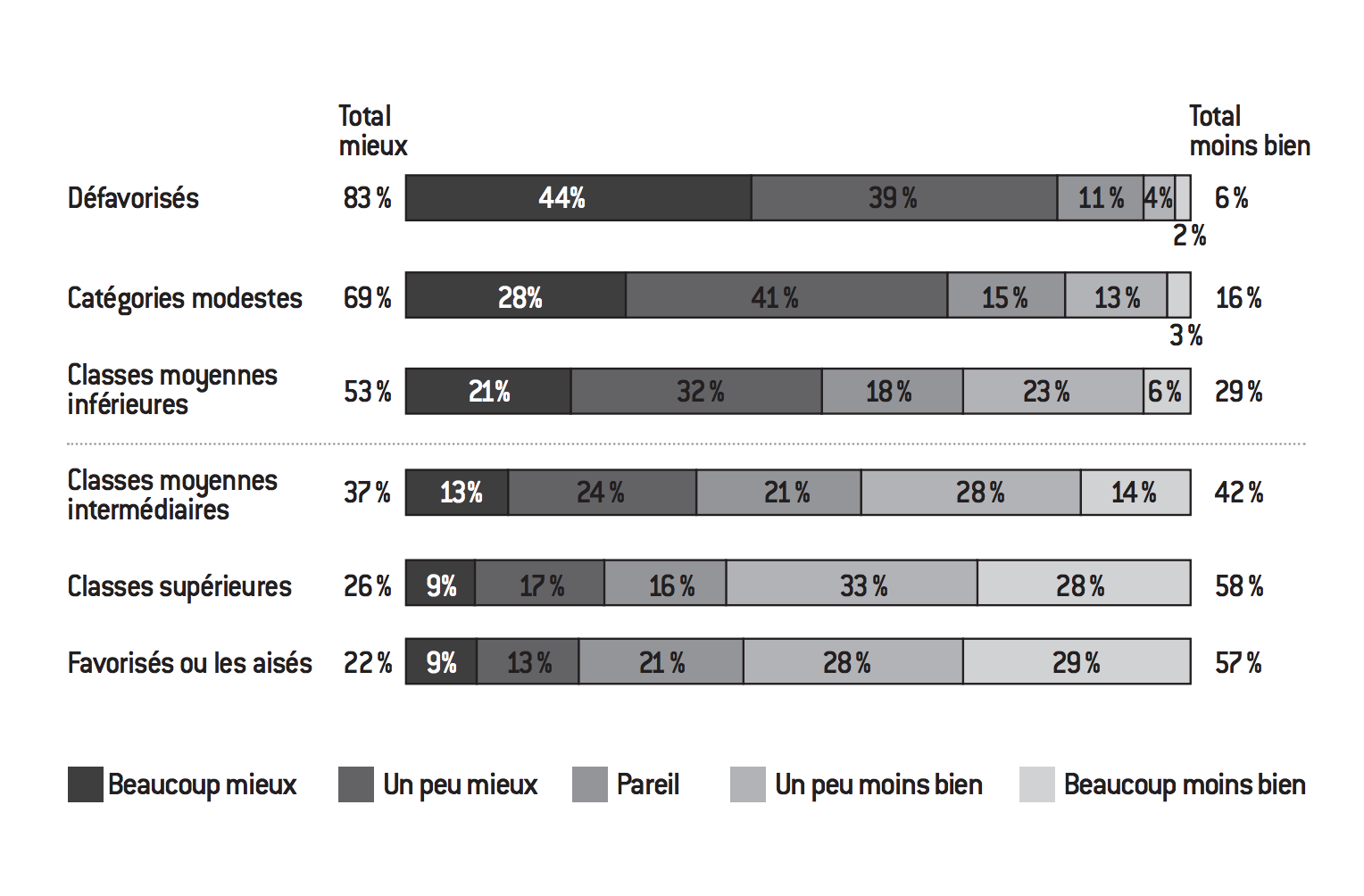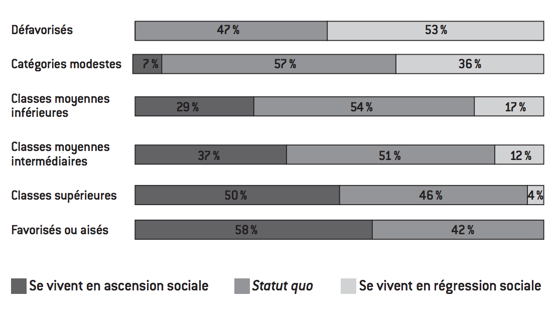 Pour résumer, si le sentiment d’avoir bénéficié de l’ascenseur social est seulement majoritaire au sein de la classe supérieure ainsi que des favorisés ou aisés, il devient minoritaire dès que l’on descend dans les classes moyennes. Il est néanmoins suffisamment répandu pour que ces dernières se distinguent à leur tour des catégories modestes et défavorisées, chez qui la perception du déclassement l’emporte largement. Et si le ressenti d’une régression sociale par rapport à ses parents concerne une fraction des classes moyennes, il y est toujours moins présent que le sentiment d’ascension.
