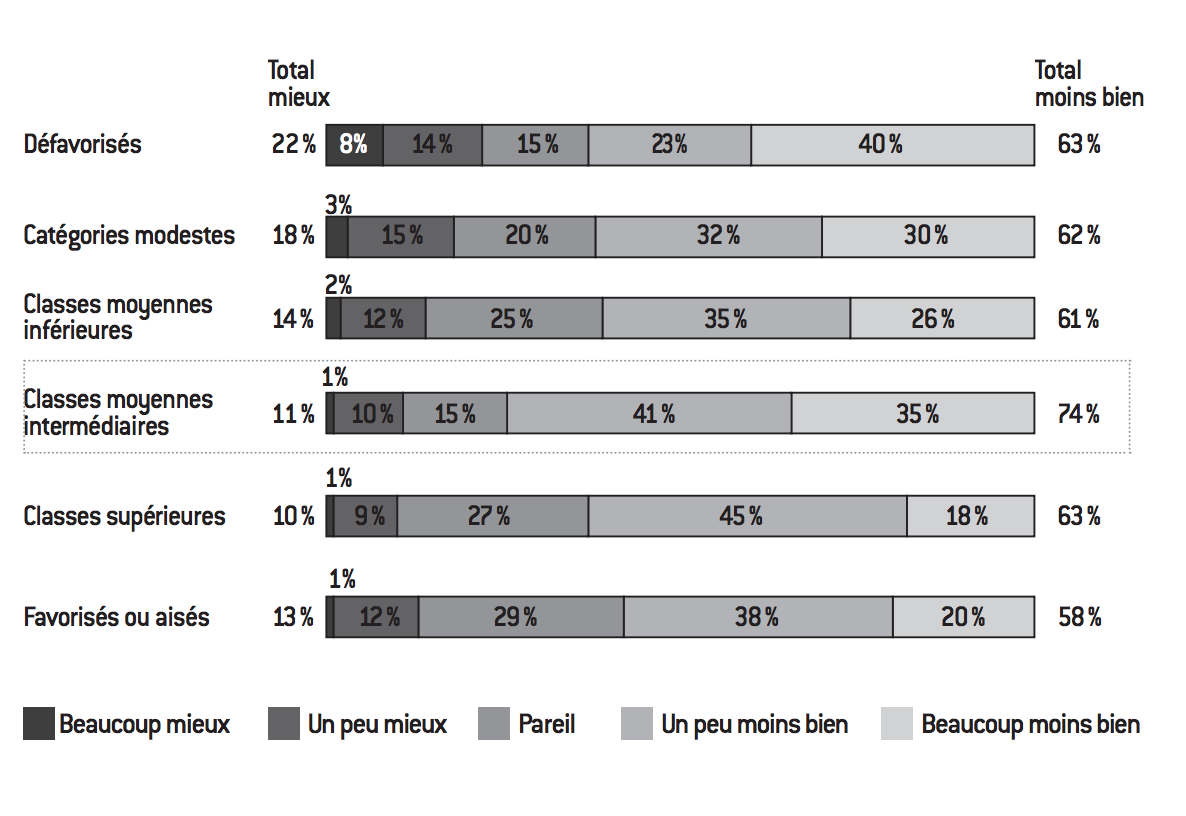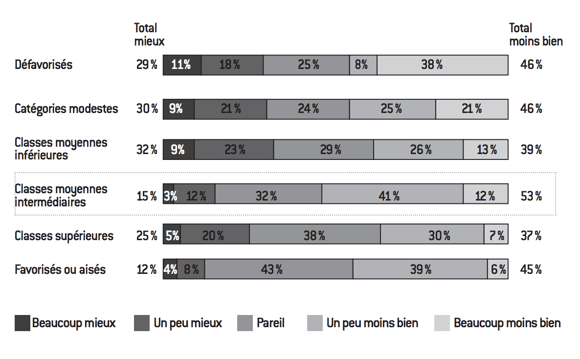 On vient de voir que l’expérience d’une régression sociale par rapport à la situation de ses parents est aujourd’hui largement minoritaire dans les classes moyennes. En revanche, la crainte du déclassement en constitue un marqueur important. Car si l’ascenseur social est essentiellement symbolisé par son mouvement ascendant, le sens inverse apparaît, en creux, tout aussi possible. La conscience de la fragilité de sa position au sein de l’échelle sociale conduit à une angoisse de l’avenir qui se traduit à plusieurs niveaux et qui n’est pas toujours directement étayée par des éléments objectifs. À ce propos, dans La Peur du déclassement, Éric Maurin écrit fort justement : « Le déclassement et la peur du déclassement : les deux phénomènes ne sont ni de même nature, ni de même ampleur, et il est essentiel de ne pas les confondre si l’on veut comprendre la société française. Un exemple suffira à montrer tout ce qui les distingue. En 2007, l’Insee recensait 14.600 sans-abri ; si l’on retient le chiffre de 100.000 personnes, avancé par les associations d’aide aux SDF, on peut calculer que 0,16% de la population vit dans la rue. Or, d’après un sondage réalisé en 2006, 48% des Français pensent qu’ils pourraient un jour devenir SDF 8. » Plus haut, l’auteur précisait : « Cette angoisse sourde [la peur du déclassement], qui taraude un nombre croissant de Français, repose sur la conviction que personne n’est “à l’abri”, qu’une épée de Damoclès pèse sur les salariés et leurs familles […]. La peur du déclassement ne règne pas tant aux marges de la société qu’en son cœur. Elle assiège les ouvriers, les employés, les travailleurs précaires, mais, plus encore, les classes moyennes et supérieures, celles qui bénéficient des meilleurs statuts et des protections les plus efficaces et qui ont donc beaucoup à perdre9. » Au travers de l’étude pour la Fondapol, l’observation de la projection dans le temps des conditions de vie fait tout d’abord ressortir – sans nier la part de fantasme de ces perceptions – un pessimisme général quant à l’avenir et une nostalgie du passé, soit le phénomène classique qui peut familièrement se résumer par la formule « c’était mieux avant ». Mais par-delà ce constat général, les enseignements de l’étude révèlent qu’il s’agit là d’un marqueur de rupture au sein même des classes moyennes. Ainsi, comme le montre le graphe ci-dessous, alors que la situation de la génération précédente apparaît comme ayant été plus confortable aux yeux de la majorité de la classe moyenne inférieure (53% estiment que leurs parents vivaient mieux qu’eux au même âge) et, a fortiori, s’agissant des catégories modestes ou défavorisées (respectivement 69% et 83%), ce score devient minoritaire auprès de la classe moyenne intermédiaire (37%) et continue de diminuer pour les catégories plus aisées.