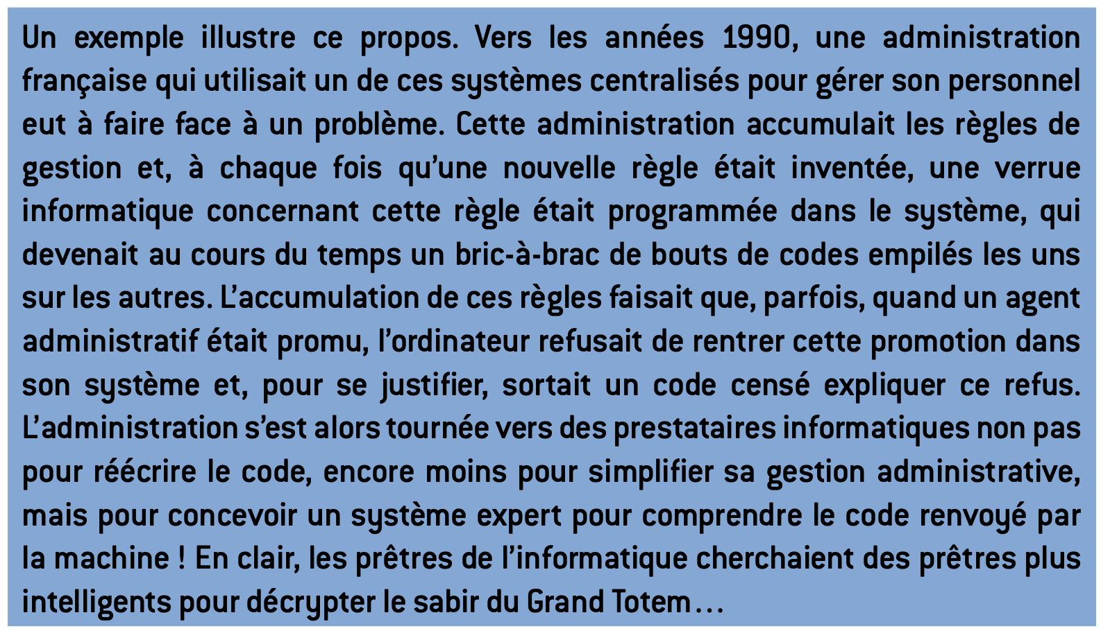Cet extrait illustre une caractéristique amusante des managers dans la plupart des grandes structures : ils sont à la fois individuellement très intelligents et collectivement idiots. Le système est bloqué, il n’encourage plus le mouvement et l’entraide au service du mieux.
