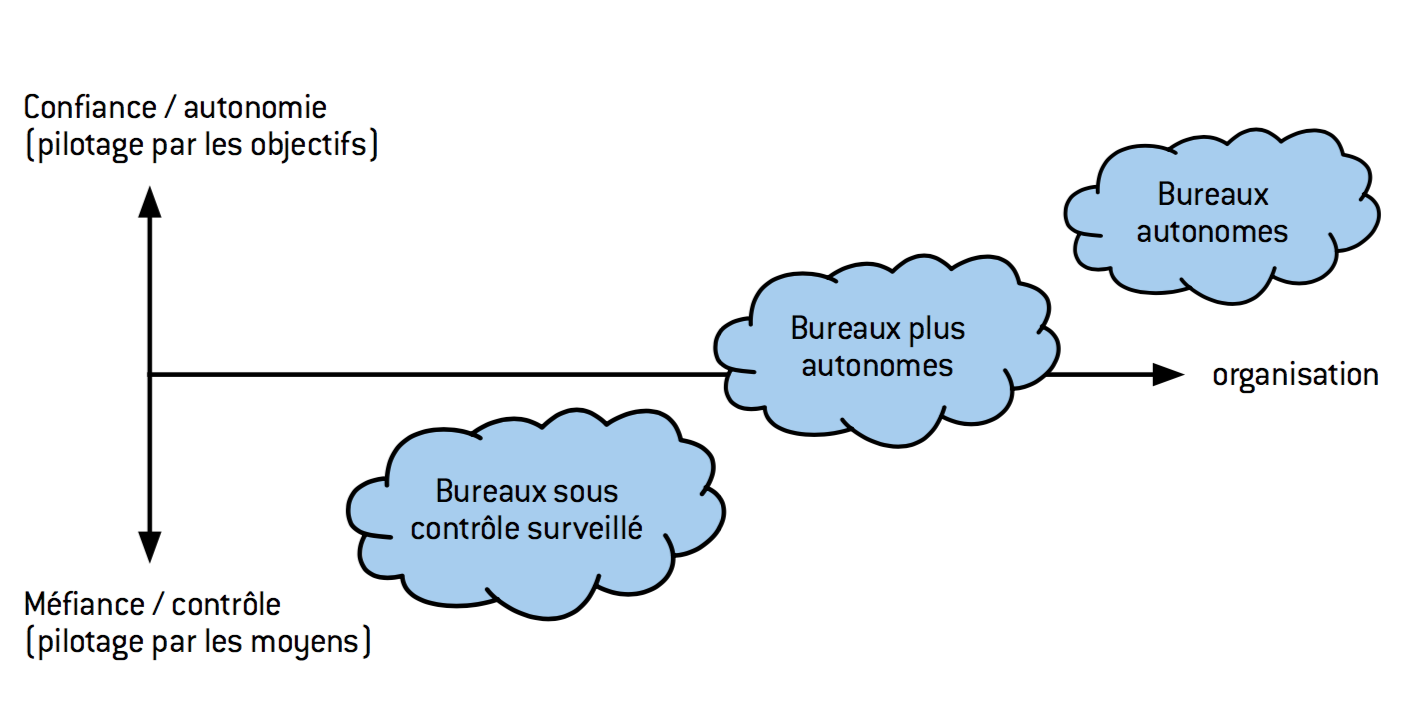 Ce que Parkinson ne nous dit pas, c’est pourquoi la bureaucratie avance-t-elle encore et toujours ? Quel est son moteur profond ? Pourquoi acceptons-nous d’être payés pour un travail que nous savons peu satisfaisant lorsque nous avons le courage d’observer notre contribution réelle à la satisfaction de clients ou d’usagers ? Pour qui a tenté une amélioration de procédés dans une bureaucratie, la réponse est assez simple : innover consiste toujours à faire différemment, et donc risquer de déplaire, jusqu’à l’ostracisation pour ceux qui se montrent trop insistants. Cette peur légitime de s’écarter des voies tracées n’est pas l’unique apanage des opérationnels. Les responsables sont même généralement les plus conservateurs. Pour eux, modifier le système revient à changer le paradigme par lequel ils ont été promus, donc risquer encore plus que nous, modestes bureaucrates de rang inférieur. Inverser le paradigme de la spécialisation et du contrôle, c’est passer de la recherche de dépendance à celle de l’autonomie des usagers qu’ils servent, qu’ils soient clients ou employés dans l’entreprise. C’est-à- dire, finalement, faire en sorte de disparaître, de devenir transparent : passer de la posture de méfiance – « tout passe par moi» – à celle de confiance – « tout a été fait pour que vous puissiez agir seul, je reste à votre disposition pour toute aide ». Imaginez un instant votre direction financière, votre direction des achats ou votre direction des ressources humaines dans ce mode de fonctionnement…