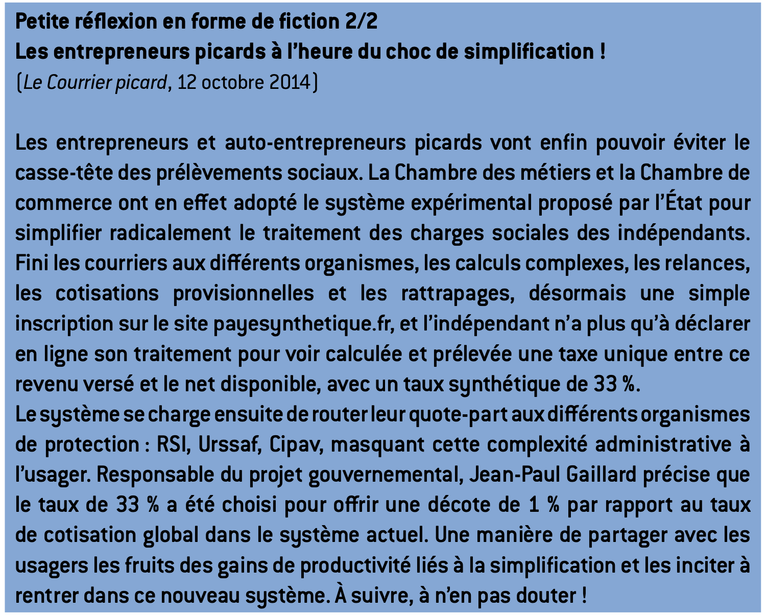 Cette démarche pourrait peut-être inspirer d’autres chantiers, comme par exemple la mise en place de la simplification fiscale, du prélèvement à la source, non par un chantier massif impossible, mais au contraire par déploiement dans des cercles d’entreprises et d’individus motivés par le volontariat dans un système ouvert radicalement nouveau.