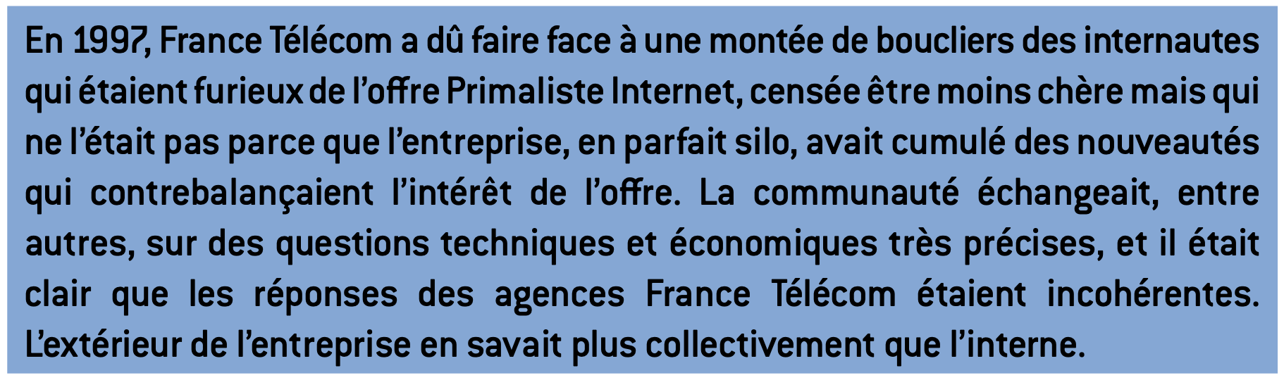 L’extérieur de l’entreprise, à l’inverse, a compris l’intérêt des modèles communautaires. Les clients sont en réseau dans des forums de discussion, sur Twitter, dans des blogs ou dans les divers réseaux sociaux, se trouvant d’un seul coup investis d’un pouvoir qu’ils ne soupçonnaient pas.
