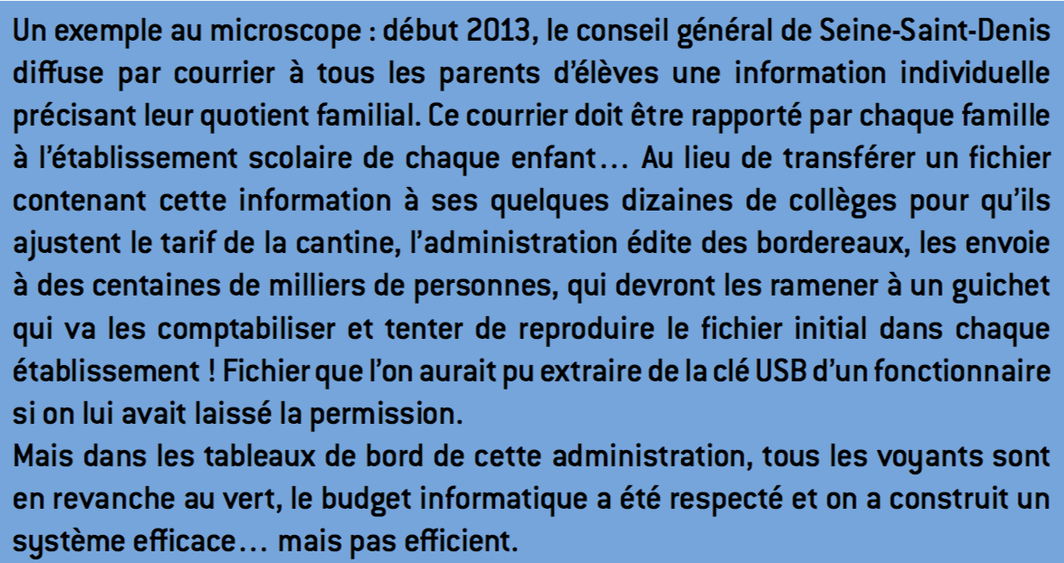 Car, à l’heure où l’Urssaf ne répond plus, même à 0,10 euro la minute, qu’avec mépris et arrogance à toute demande « non standard », où aucune innovation sensible n’est venue enrayer la lente dégradation des services de Pôle Emploi ou de la formation professionnelle depuis leur création, où l’encroûtement, la division des responsabilités, le poids de la hiérarchie et du contrôle empêche toute velléité interne de servir correctement les usagers, où l’empilement des mesures et des règlements est la règle, alors que la simplification est le seul vecteur d’économie, mais surtout de démocratie, nous sombrons dans une tyrannie des experts, où la moitié des bénéficiaires du RSA ne réclament pas leur droit17, où des règlements sournois empêchent l’utilisation d’engrais naturels18, où il faut batailler des heures pour accéder aux bulletins scolaires de son fils, compilés dans un système abscons mais national !