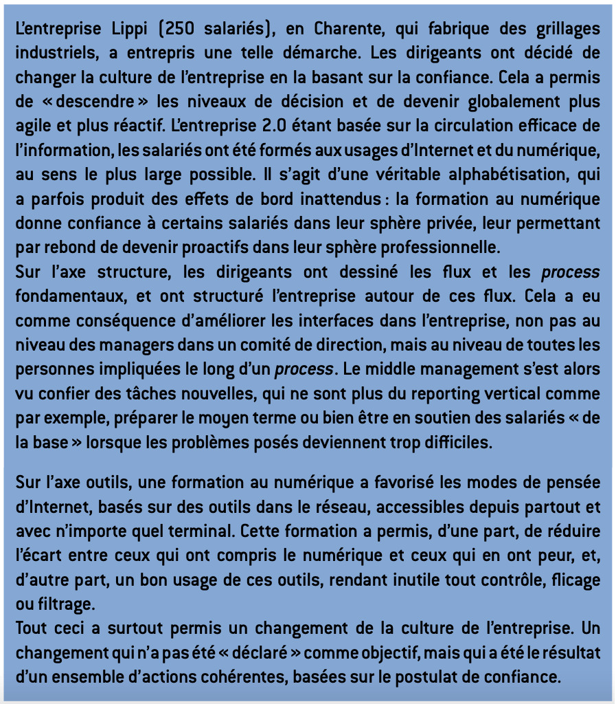 L’impact d’Internet sur ces trois axes est immense. Sur la structure de l’entreprise, il favorise le modèle communautaire. Sur les outils, il apporte des solutions bien moins chères et un autre mode de pensée qui favorise le travail collaboratif et le partage. Sur les comportements, il apporte l’empowerment, l’autonomie, c’est-à-dire la capacité de chacun à pouvoir prendre des décisions à son niveau et, avec elle, le plaisir, le fun. Pour l’entreprise, il est important de travailler sur ces trois axes de manière harmonieuse. Utiliser des outils de type réseaux sociaux sur une hiérarchie en place fabrique des schizophrènes, puisqu’elle enferme les salariés dans une double contrainte (« échange librement avec tes pairs, mais moi, chef, je juge »). Demander aux salariés de mieux travailler ensemble sans offrir des outils efficaces de gestion de l’information et de la connaissance est contre-productif, puisque cela les prive d’un outil de production fondamental. Rester dans un modèle basé sur la méfiance est une erreur grave qui coûte très cher en procédures administratives inutiles et finit par faire perdre des clients lorsque le marché est honnêtement compétitif.