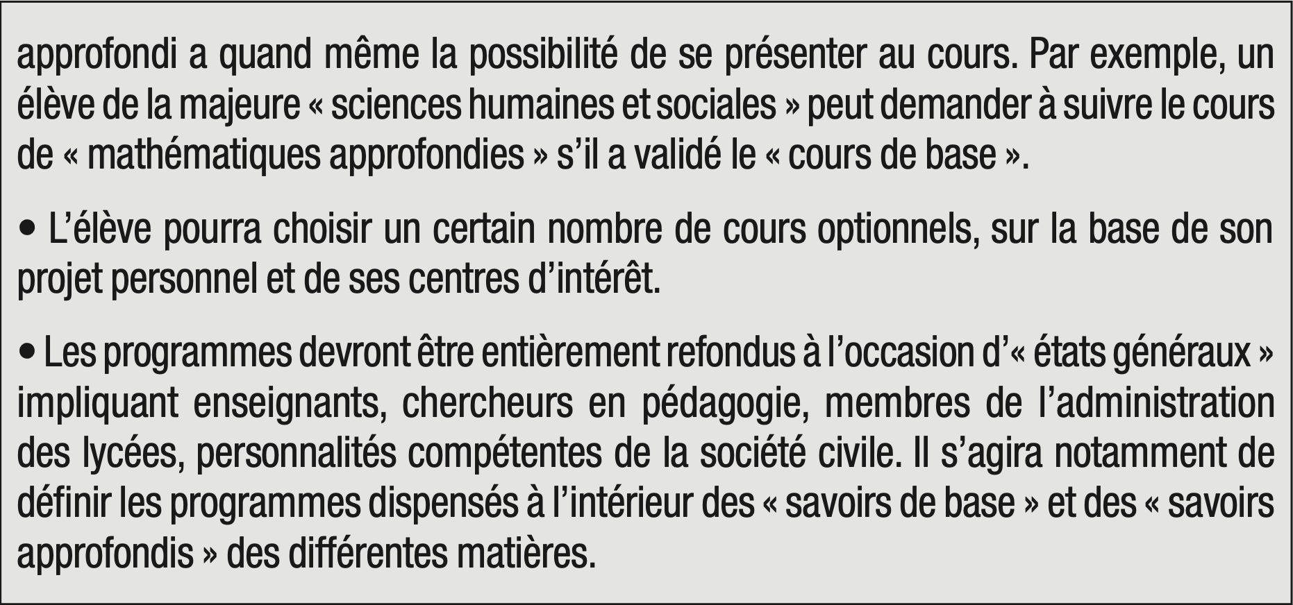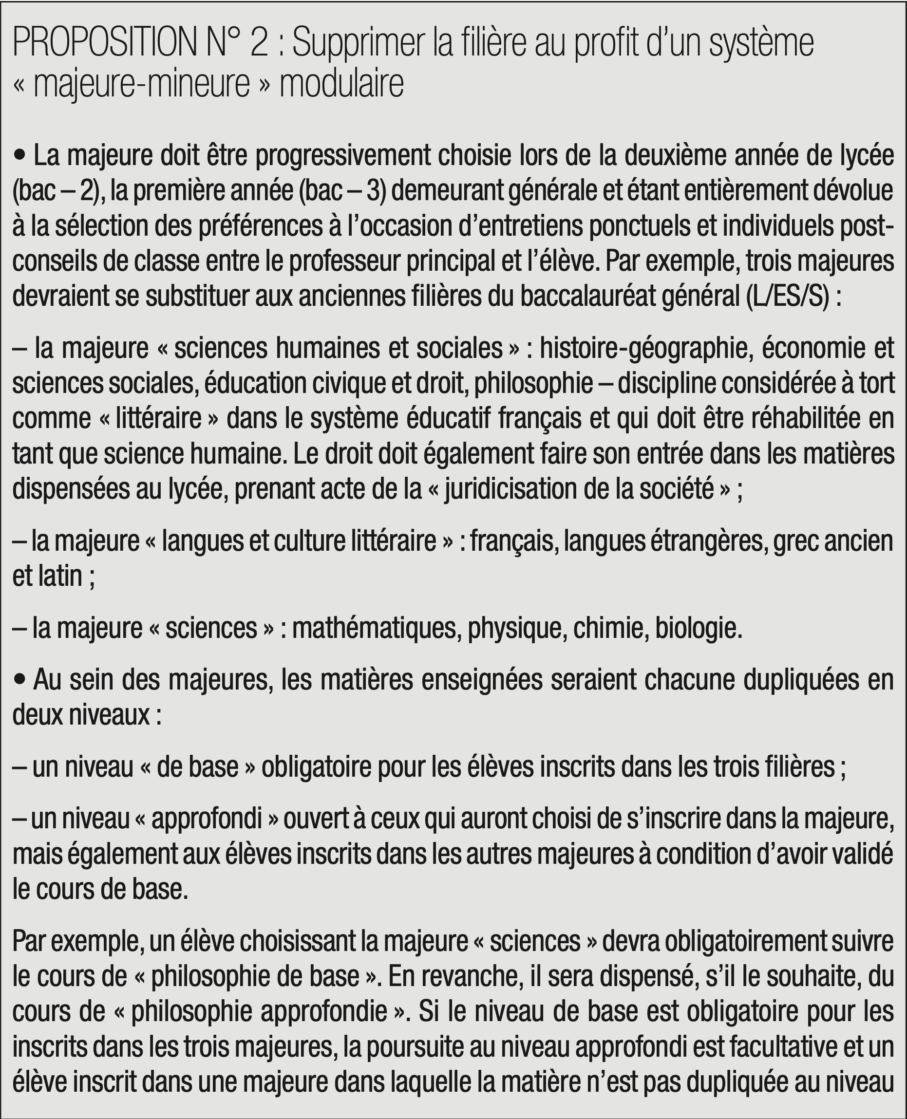 La rigidité du cursus scolaire au lycée est un caractère très français. Ce système est peu efficient. Le sentiment d’affectation subie par certains élèves conduit à des « déraillements » qui se traduisent, au mieux, par un redoublement et donc par la perte d’une année ; au pire, par un risque de déscolarisation et de décrochage. Il est par ailleurs infantilisant car il postule que l’élève est incapable de construire son cursus, à l’heure où les employeurs demandent de la proactivité et de l’autonomie, qualités qui sont appelées à devenir fondamentales dans les prochaines décennies.