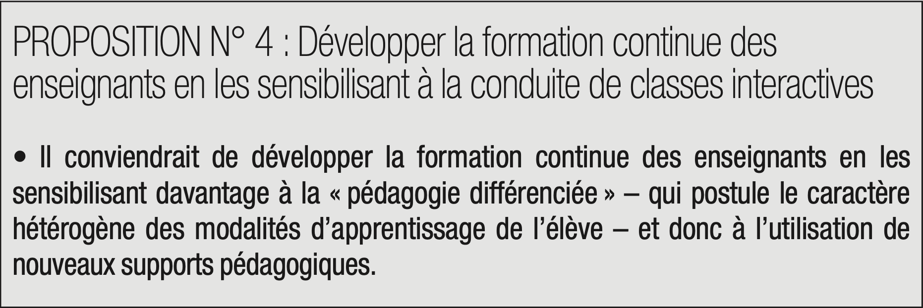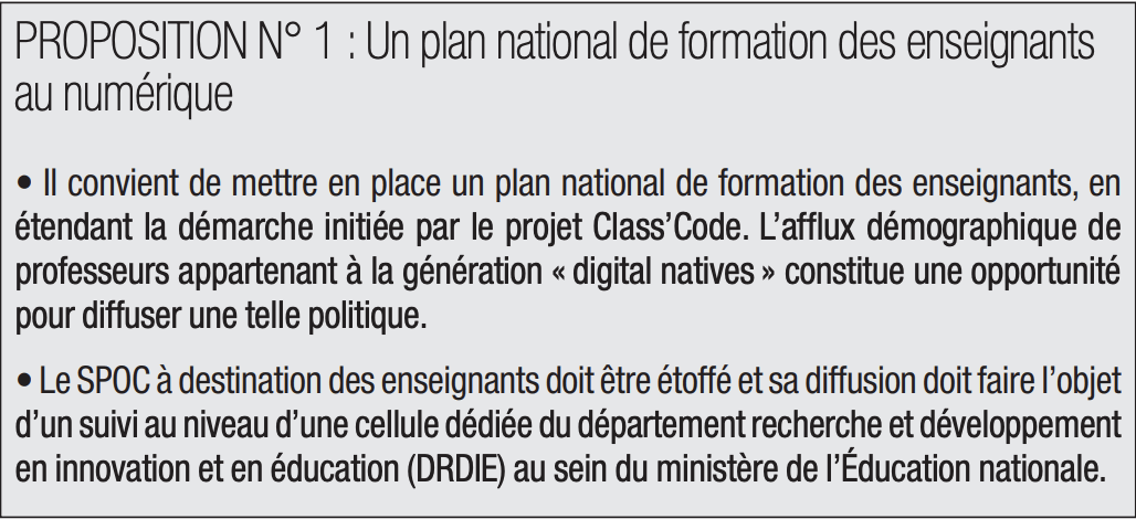 L’accélération du changement technologique oblige ainsi l’Éducation nationale à repenser sa pédagogie, qui souffre de pesanteurs trop importantes. L’enseignement abstrait, s’il demeure nécessaire pour développer les qualités cognitives, doit également incorporer un socle de compétences utiles, directement opérationnelles et en prise avec les nouveaux besoins qui se font jour. Il est également nécessaire de raisonner en termes de compétences, en ce que les compétences déterminent les savoir-faire. Il convient enfin de repenser la formation professionnelle, en l’orientant davantage vers l’apprentissage et en permettant aux entreprises de contribuer à la définition des programmes (elles demeurent pour l’heure cantonnées à un rôle consultatif).