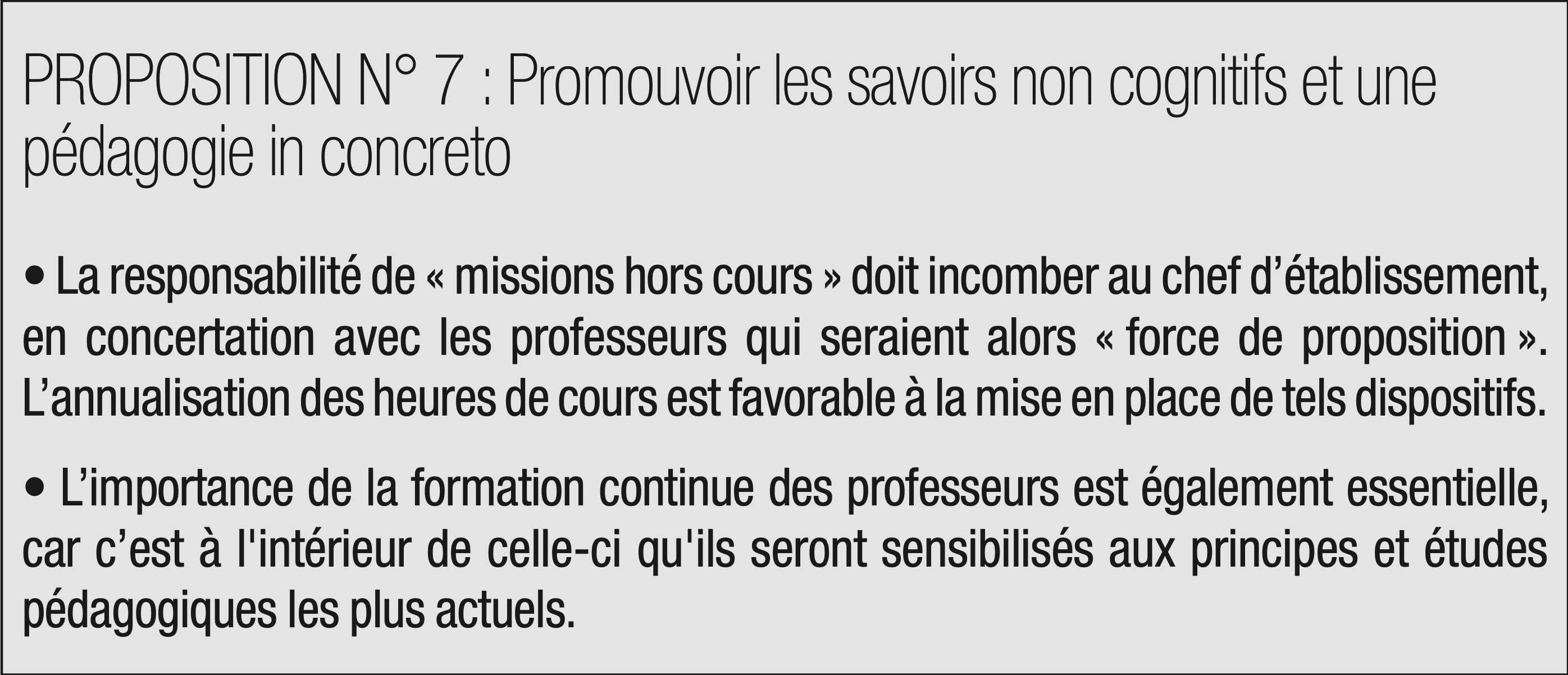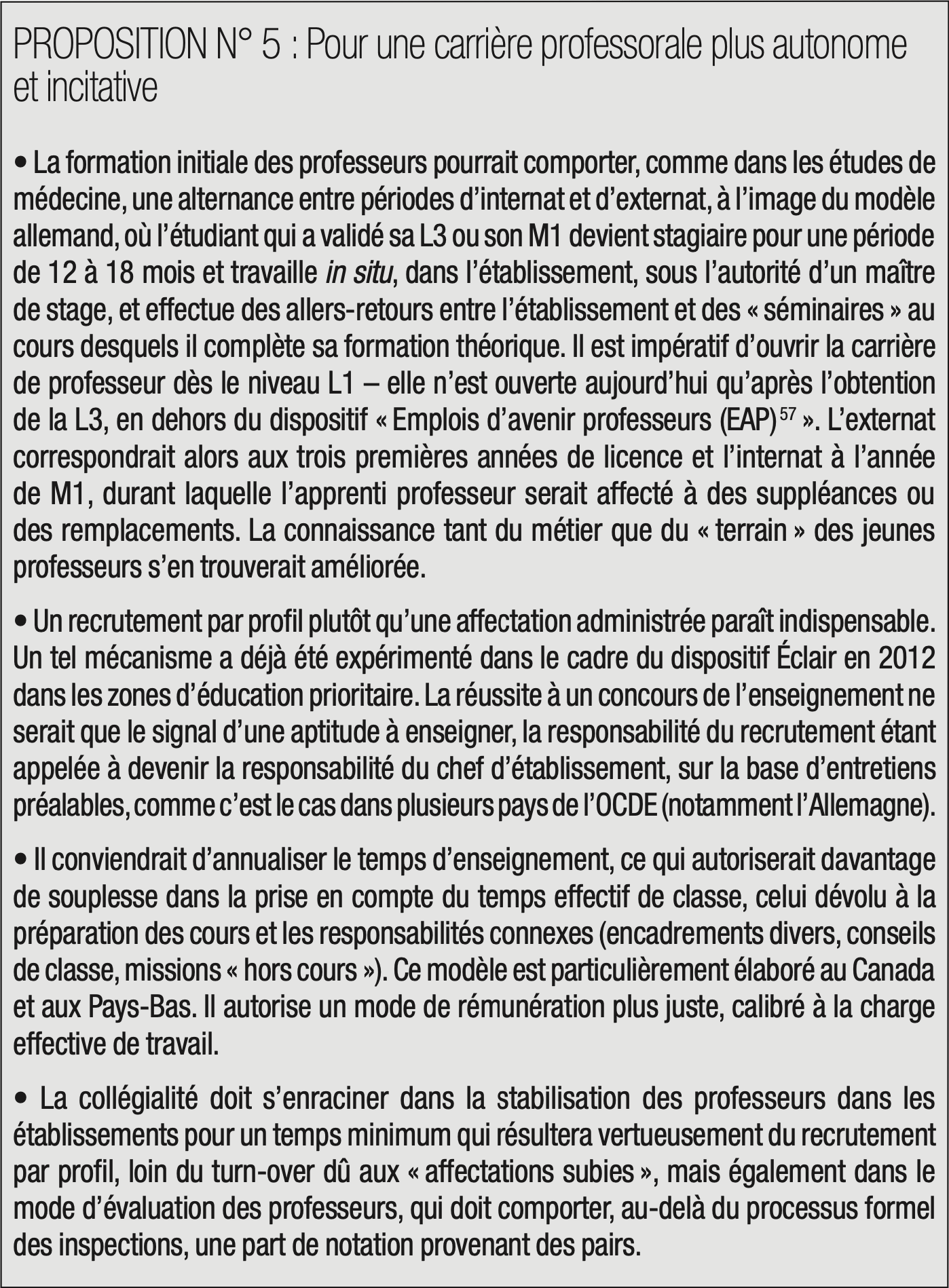 Il conviendra également de mettre fin à la préférence pour la centralisation, passion française qui déprime les initiatives locales, et de valoriser les projets pédagogiques sur mesure, la volonté d’autonomie des acteurs, notamment du corps professoral. L’éducation de demain doit être réactive, dans un monde en perpétuelle mutation, souple et adogmatique. L’enseignement professionnel doit également se dépouiller de son image négative et doit devenir une voie d’excellence, élective et désirée, au diapason des contingences de l’appareil industriel et des nouvelles compétences qui se font jour. L’enseignement professionnel doit pour cela impliquer davantage les branches et les entreprises et gagner en simplicité.