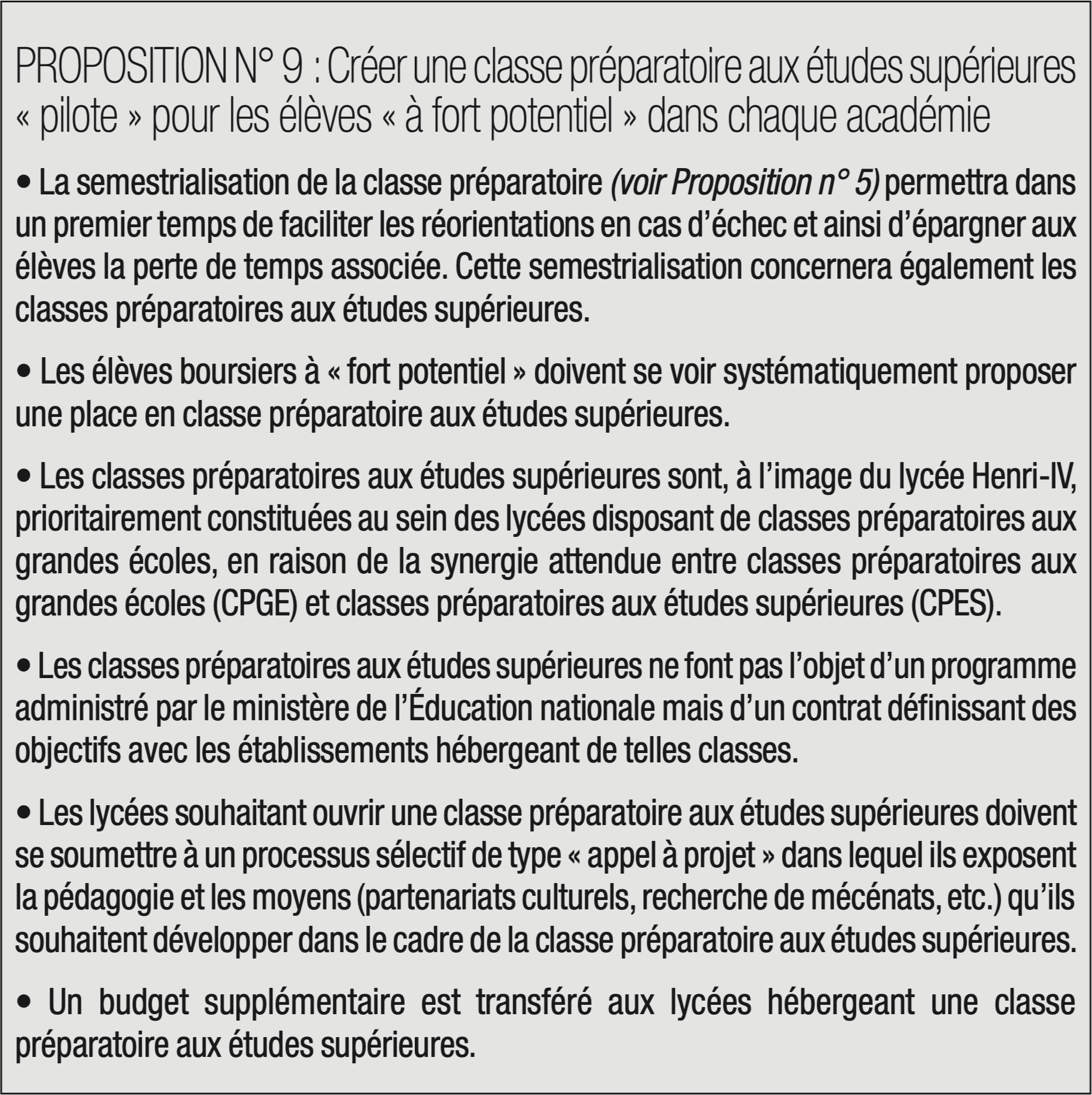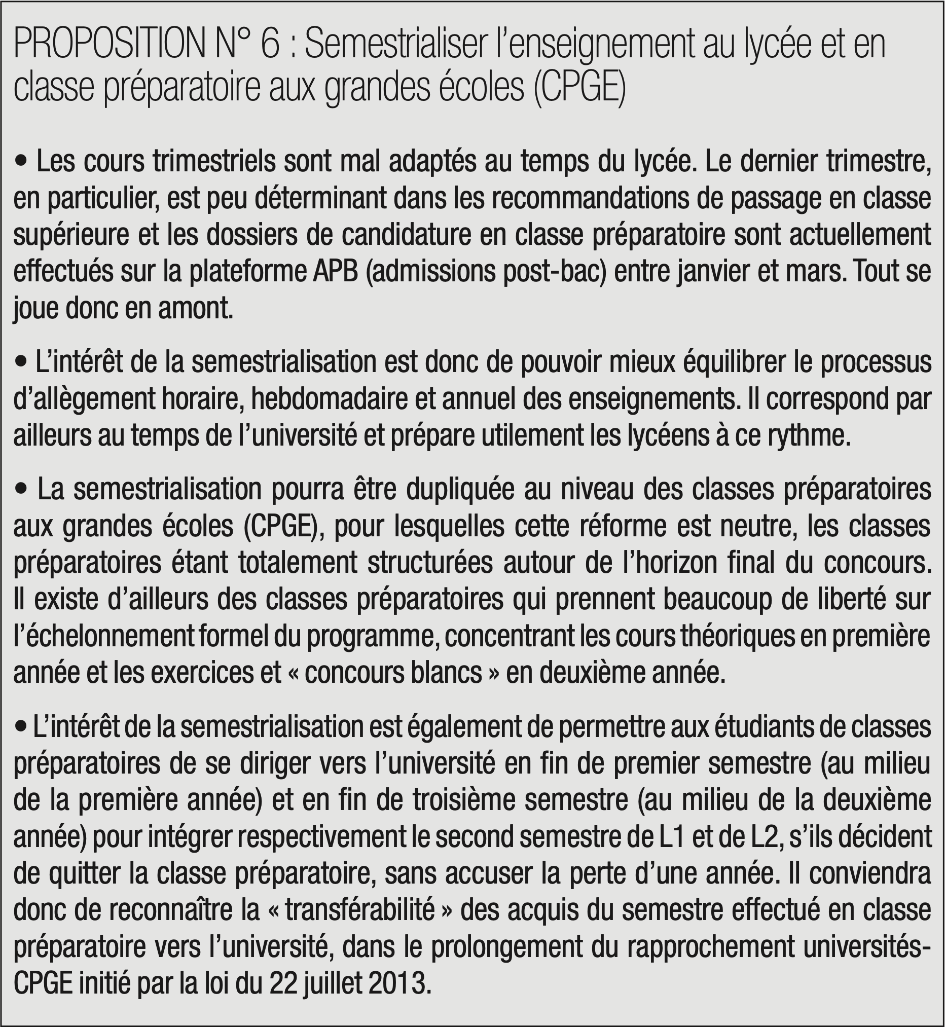 Coûteux et de moins en moins déterminant dans la suite de l’orientation des diplômés, le baccalauréat ne doit plus être l’aboutissement symbolique des études secondaires et doit mieux s’articuler avec le supérieur. Le raisonnement « bac – 3/bac + 3 » doit donc présider davantage aux politiques de l’éducation et les modalités de passage du baccalauréat doivent être réorganisées au profit d’une part de contrôle continu.