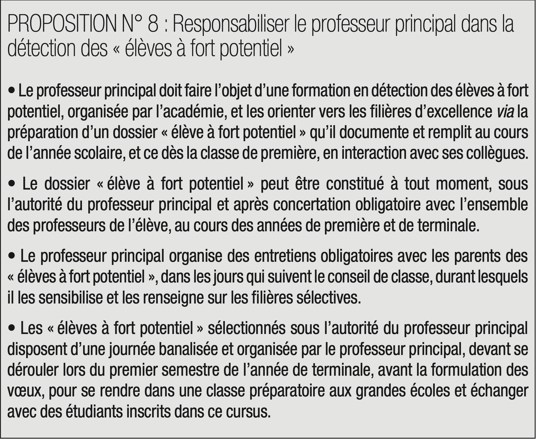 L’inégalité d’accès à l’information affectant l’orientation doit être combattue par une meilleure détection des élèves méritants, la création de classes pilotes préparatoires aux études supérieures dans chaque académie et la reconnaissance des savoirs non cognitifs.