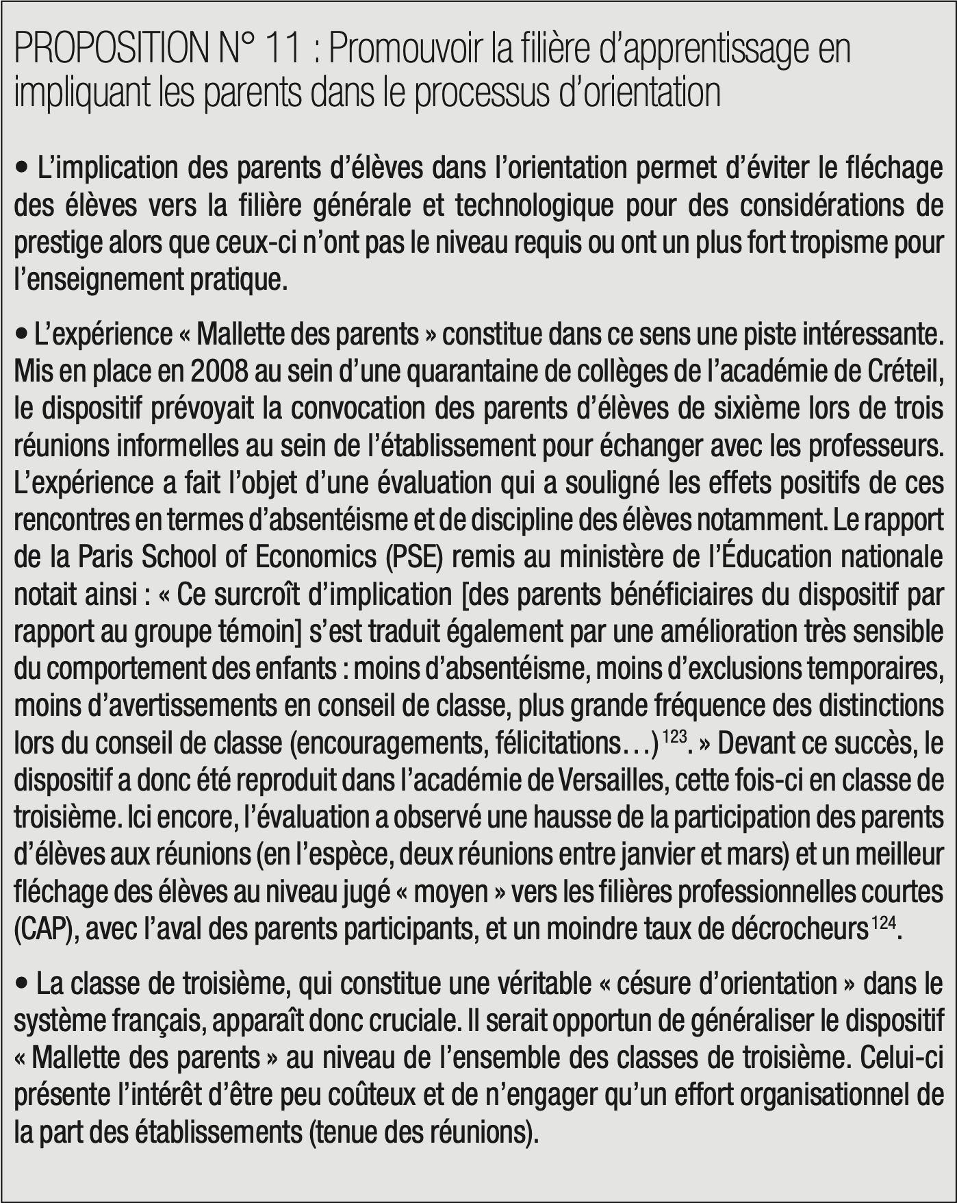 Ces recommandations vont dans le bon sens. Elles ont toutes été incorporées dans le programme du nouveau président de la République. Dans son objectif 2 (« Faire de l’alternance le cœur de l’enseignement professionnel »), ce programme souhaite notamment la création d’un « “sas” de préparation à l’alternance à la fin du collège » visant notamment à s’assurer que « les élèves maîtrisent les savoirs de base et sont en capacité de s’intégrer à l’entreprise d’accueil122 ». Cet objectif doit aller de pair avec une politique d’orientation appropriée des élèves en classe de troisième et l’implication des parents.