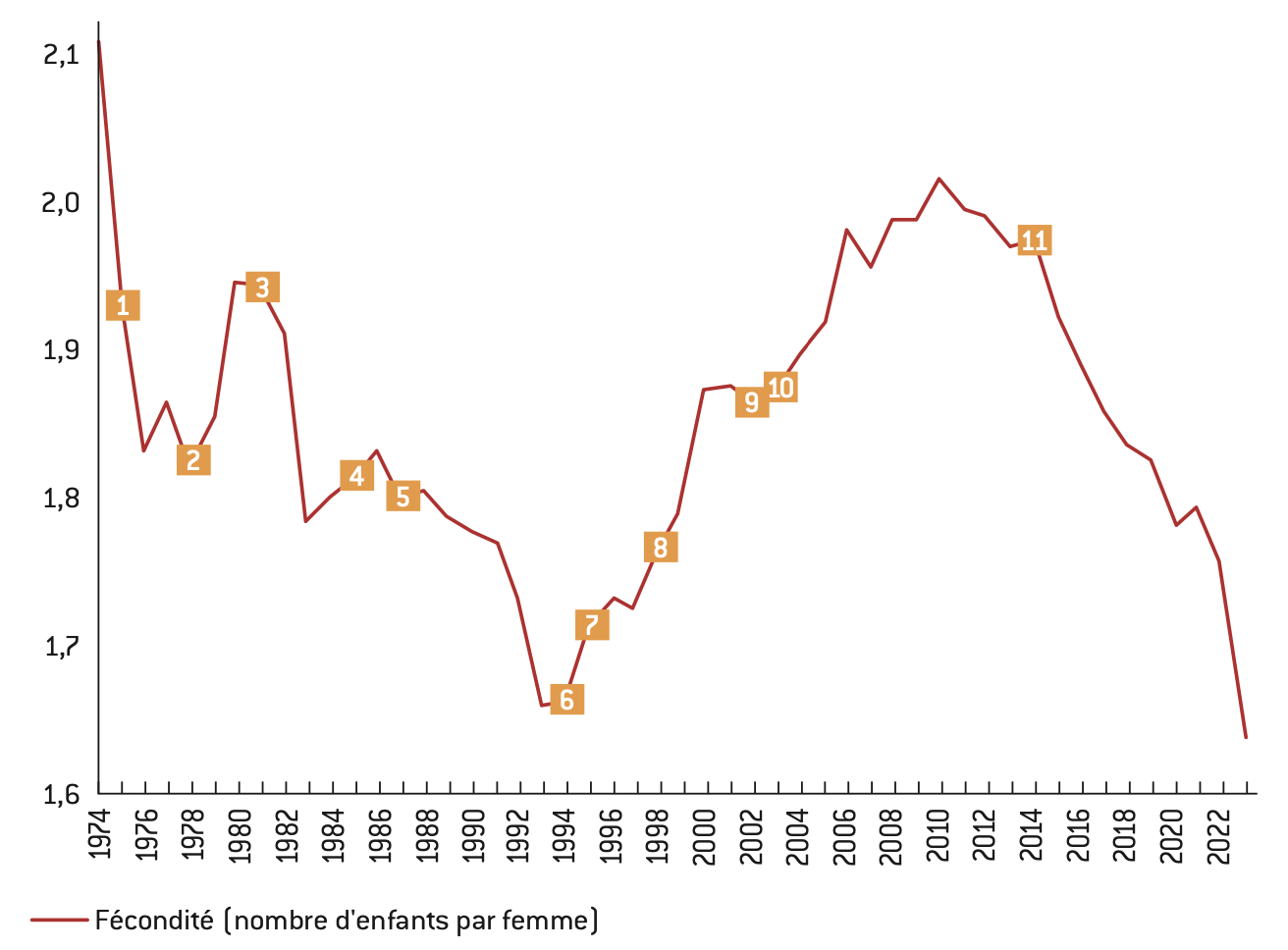 Pendant cette période allant des années 1970 au début des années 2010, les incessantes modifications opérées dans la politique familiale, qui sont évidemment ressenties par la population, ne sont pas sans effets sur la fécondité comme cela a été le cas dans les décennies précédentes en France ou à l’étranger11. Après la période de changement structurel du régime démographique naturel lié aux nouveaux moyens de contraception12, la fécondité de la France allait-elle évoluer de façon linéaire ? Pour répondre à cette question, examinons de façon détaillée les changements dans la politique familiale et l’évolution de la fécondité en France. Onze étapes successives se distinguent :