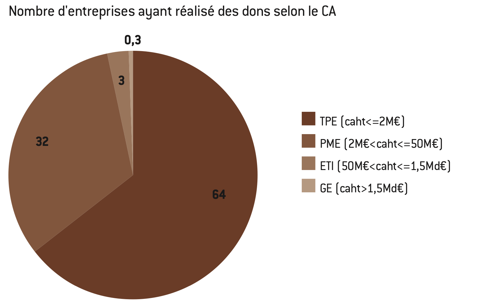 – une forte croissance du mécénat d’entreprise, particulièrement marquée par les petites entreprises : on compte alors plus de 3,5 md€, avec 46% des dons issus de petites entreprises ; le rapport de l’Observatoire de la philanthropie note que le nombre de très petites entreprises déclarant des dons a été multiplié par quatre entre 2010 et 2018 : elles représentent deux entreprises mécènes sur trois ;