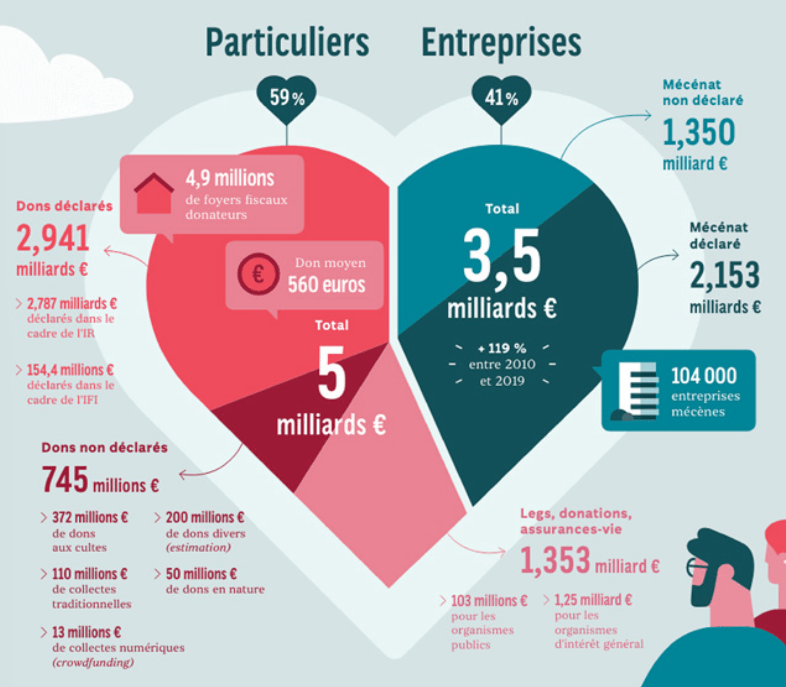 – une progression du montant global des dons des particuliers, malgré le nombre de donateurs en baisse : sont déclarés près de 2,9 md€ en 2019 (alors qu’environ 5 md€ de dons sont effectués, ce qui est dû au fait que les Français ne déclarent pas nécessairement les dons). La croissance relative est portée par les plus aisés et les plus âgés ;