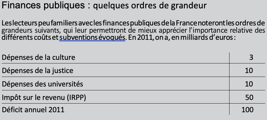 À titre de comparaison, en 2010, les dépenses publiques s’élèvent à 3 milliards d’euros pour la Culture, à 10 milliards pour l’ensemble des universités, à 10 milliards également pour la Justice, et le produit de l’impôt sur le revenu des personnes physiques s’élève à un peu moins de 50 milliards.
