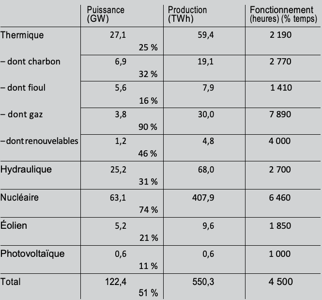 Ce tableau appelle plusieurs commentaires. Il montre d’abord le rôle dominant du nucléaire dans la production française d’électricité : environ 75% (et 2010 était une mauvaise année pour le nucléaire). Il est suivi par l’hydraulique, qui assure 12% de la production, et le ther- mique, pour 11%. La part de l’éolien est, en 2010, de 1,7% ; celle du photovoltaïque est encore négligeable, avec 0,1%, mais ces parts sont en augmentation très rapide.