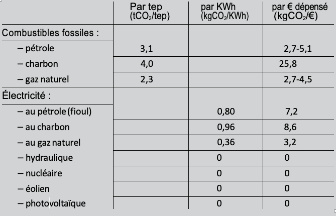 On voit que, pour les combustibles fossiles directement utilisés, le charbon rejette (pour 1 tep) bien plus de CO2 que le pétrole, qui rejette lui-même bien plus de CO2 que le gaz naturel. Il en va de même pour l’électricité produite à partir des combustibles fossiles (pour 1 KWh produit). L’électricité produite par les autres sources, c’est-à-dire le nucléaire, l’hydraulique, l’éolien ou lephotovoltaïque, en revanche, ne rejette pas du tout de CO2 (la prise en compte du CO2 rejeté lors de la construction des installations nucléaires, éoliennes, hydrauliques ou photovoltaïques conduirait à nuancer ce propos en faisant apparaître des rejets positifs, mais ne changerait pas la hiérarchie des modes au regard du CO2 .