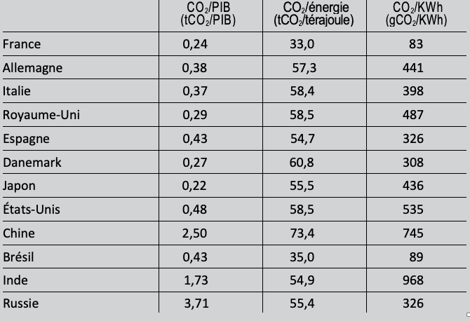 En termes de rejets de CO2 par dollar (ou par euro) de PIB, c’est-à-dire d’intensité en carbone, la France est l’un des pays les plus efficaces du monde. Dans le tableau 4, seul le Japon fait mieux. En Europe, seule la Suède fait mieux. Un pays comme l’Allemagne rejette par euro produit 60% de CO2 de plus que la France. La Chine – parfois étrangement présentée en France comme un modèle en écologie – rejette par euro de PIB dix fois plus que la France ! Cette efficacité française ne s’explique pas par une moindre consommation d’énergie (relativement au PIB), mais par un recours plus important à l’électricité et, surtout, à une électricité très économe en CO2. C’est ce que montre la dernière colonne du tableau 4. Le kilowattheure électrique français est l’un des moins polluants du monde. Seuls quelques pays, comme la Suède, la Suisse ou le Brésil, où l’électricité hydraulique est abondante, font aussi bien que la France. Ce bon résultat reflète la part importante du nucléaire dans l’origine de l’électricité produite en France.