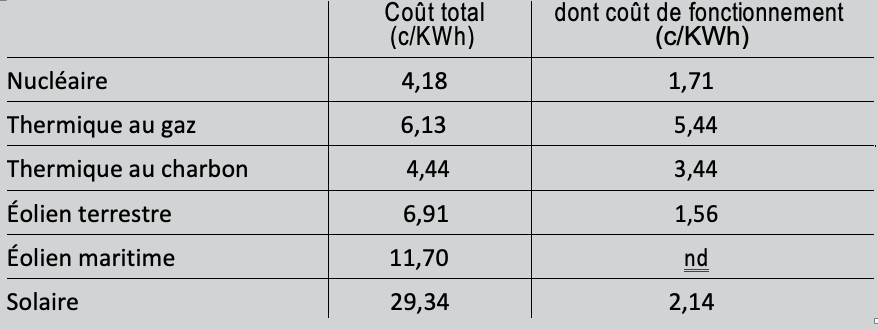 Le tableau est incomplet. Manquent notamment les coûts de l’électricité hydraulique et de l’électricité produite à partir de la biomasse, des biogaz ou des déchets. L’hydraulique est une source importante d’électricité actuelle en France, mais une source négligeable d’électricité future en France. Les autres filières sont certes intéressantes, mais un consensus semble exister sur le fait que leur développement restera modeste dans les décennies à venir.